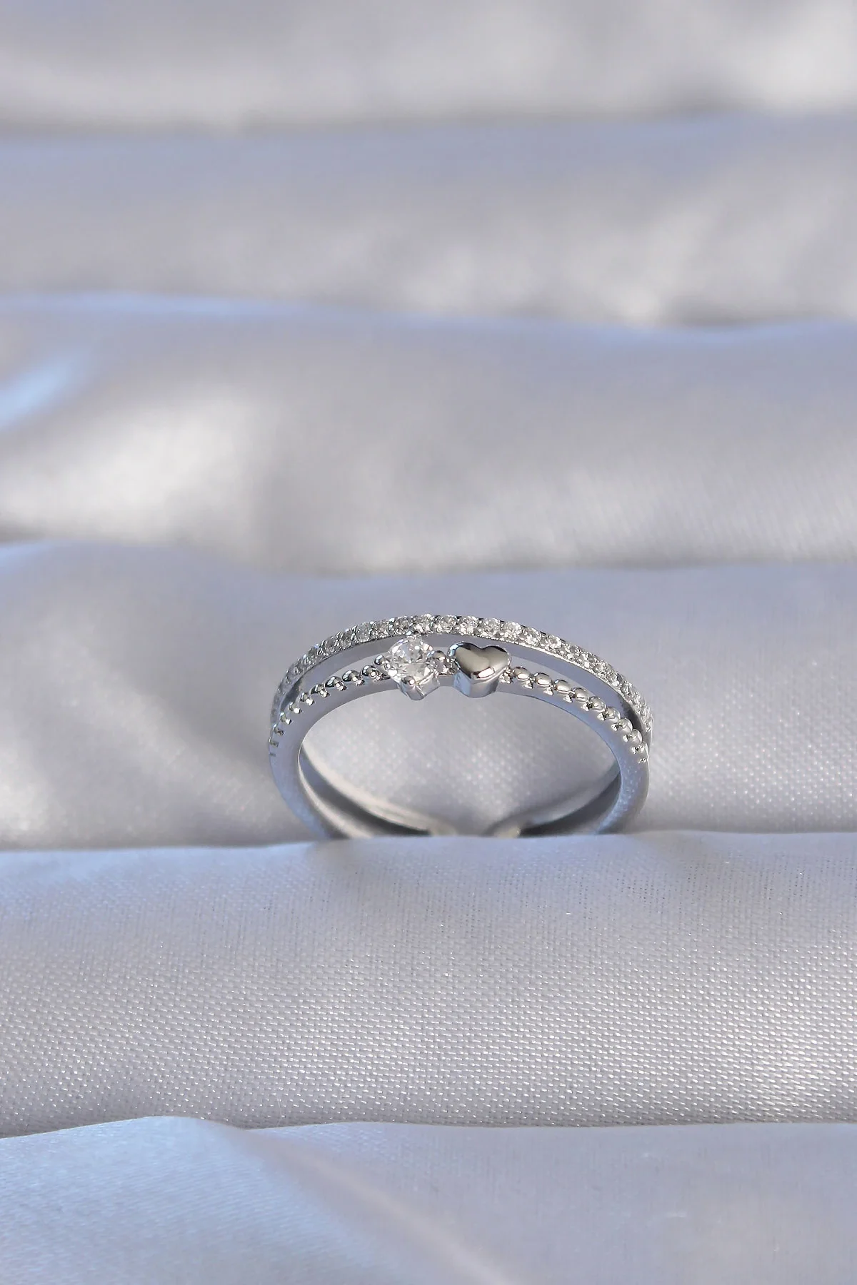 Pirinç Gümüş Renk Zirkon Taşlı Kalpli Su Yolu Model Ayarlanabilir Yüzük