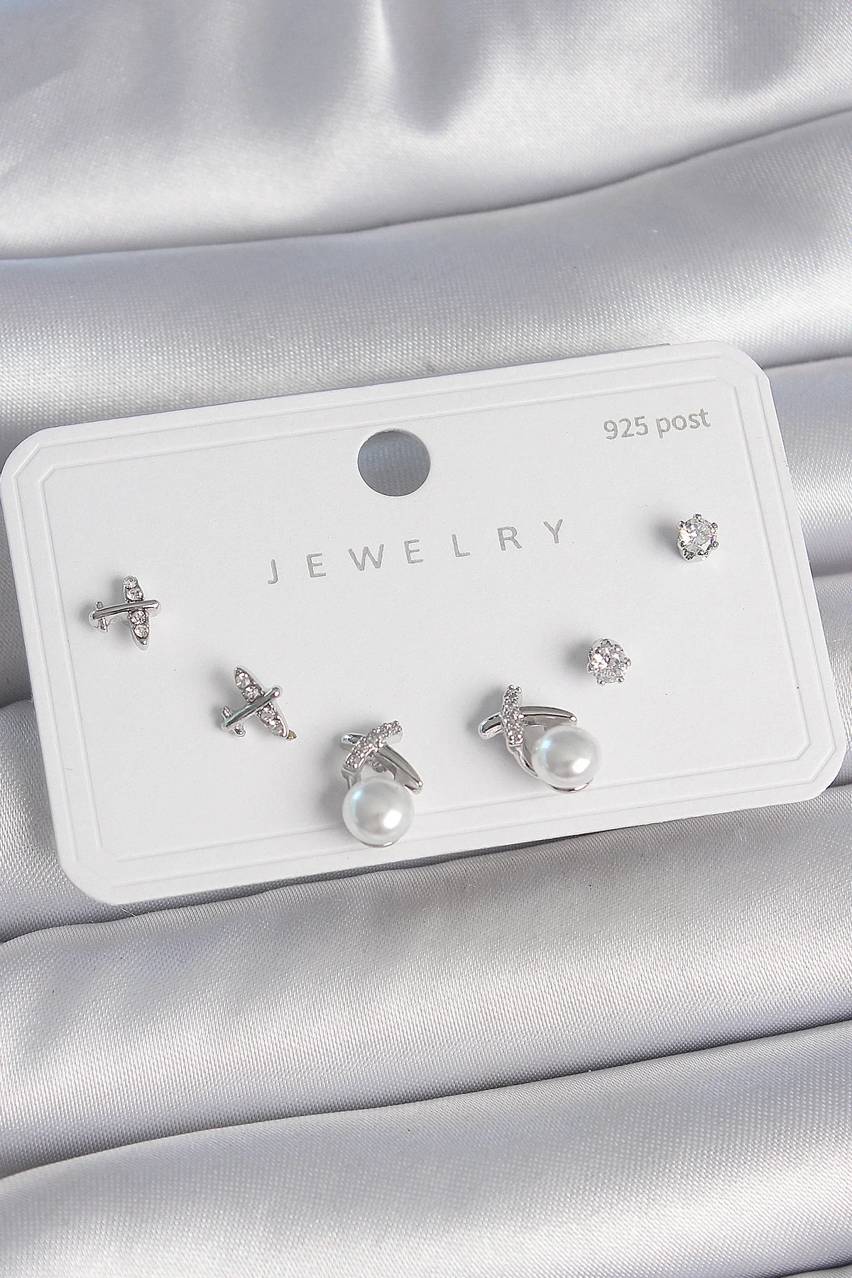 Pirinç Gümüş Renk Zirkon Taşlı Kelebek Model İnci Detay 925 Ayar Gümüş Çivi Kadın Küpe Seti