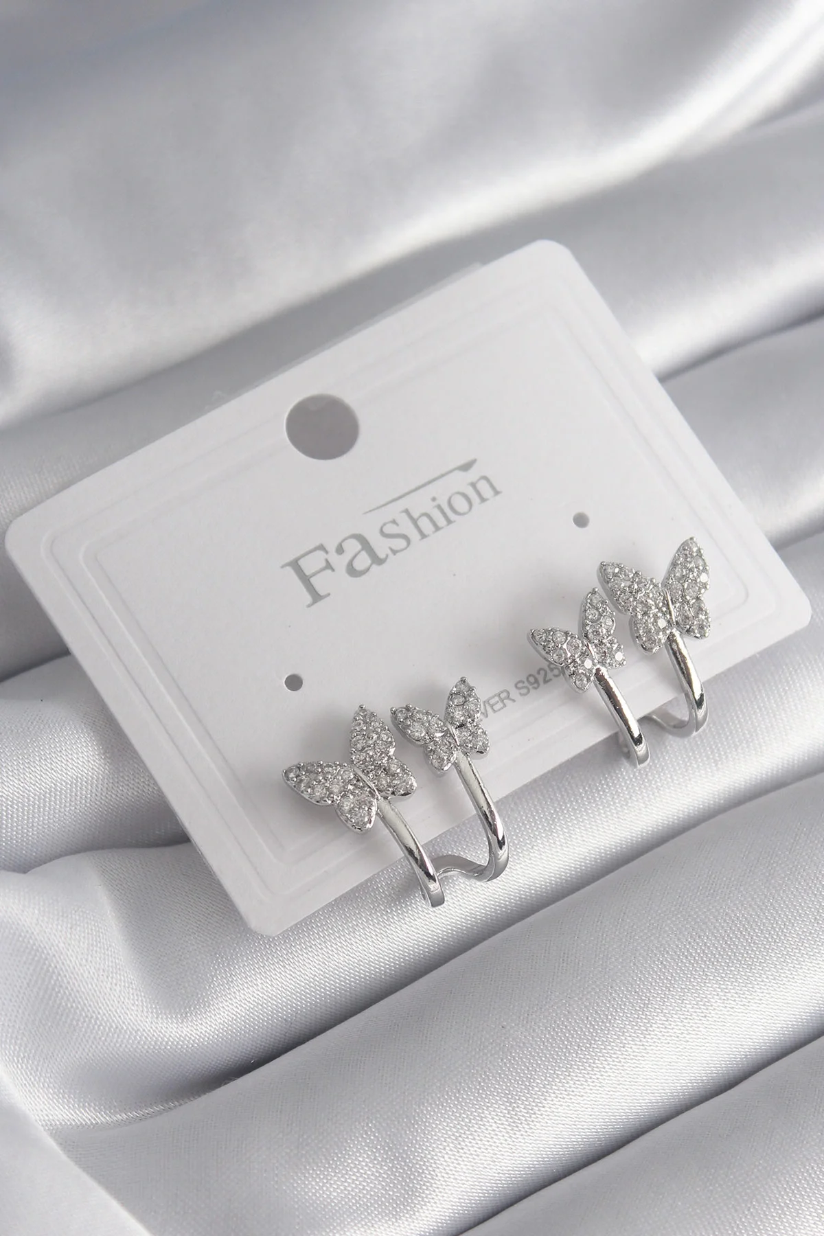 Pirinç Gümüş Renk Zirkon Taşlı Kelebek Model Kadın Küpe