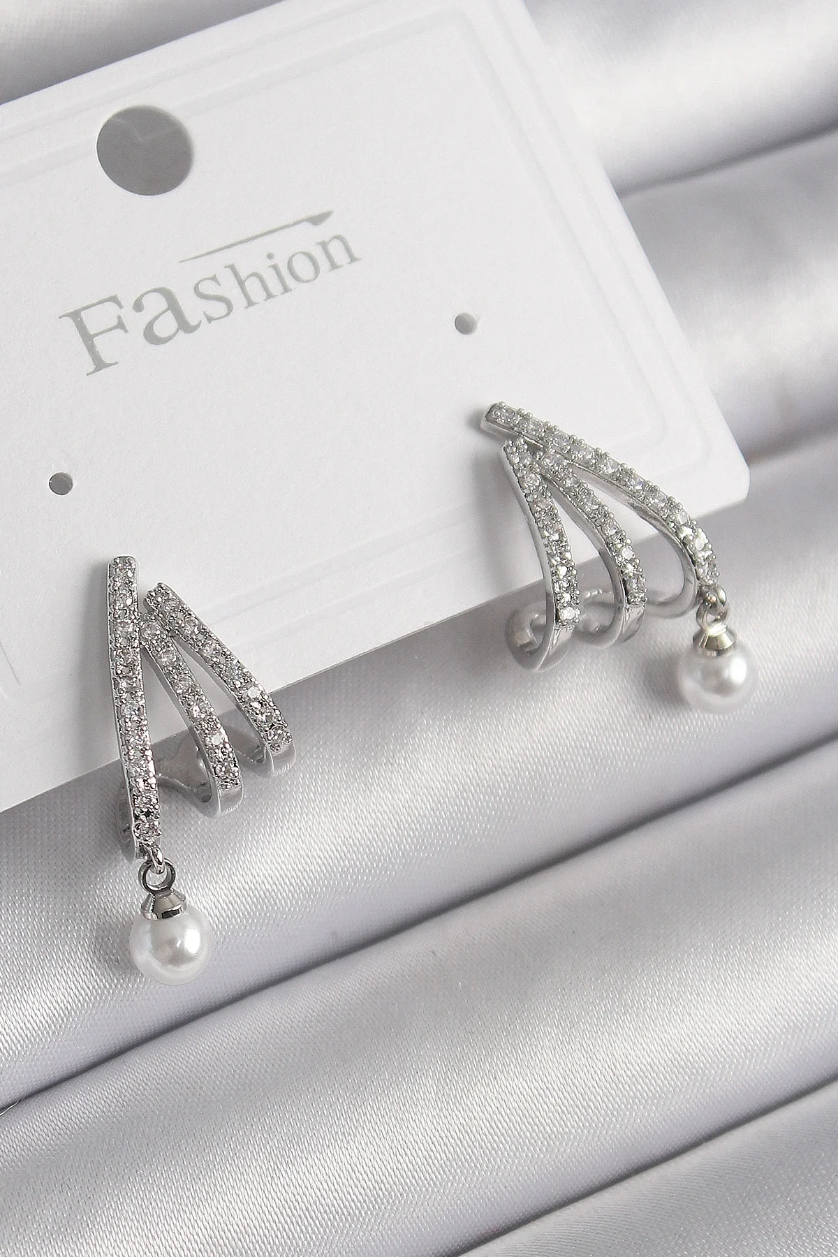 Pirinç Gümüş Renk Zirkon Taşlı Pençe Model İnci Detay Kadın Küpe