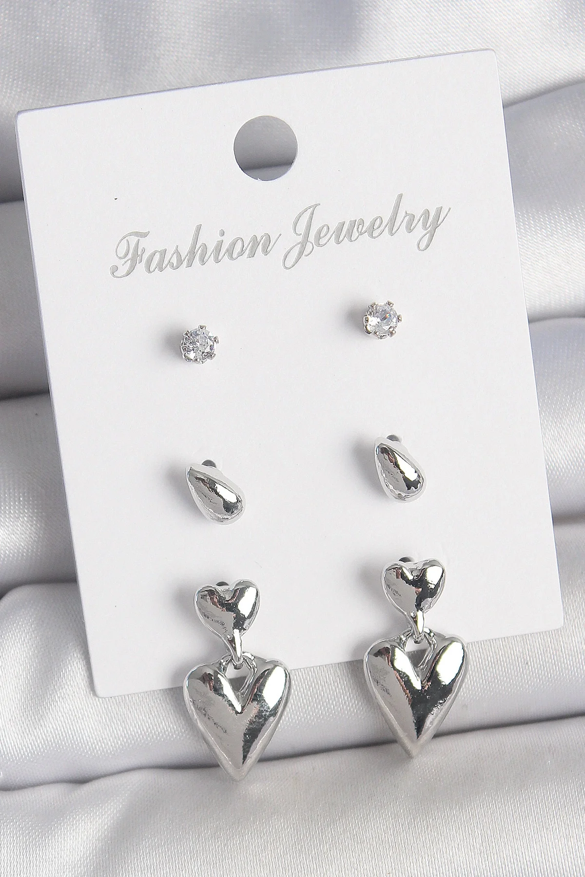 Pirinç Gümüş Renk Zirkon Taşlı Sallantılı Kalp Model 3 Çift Kadın Küpe Seti