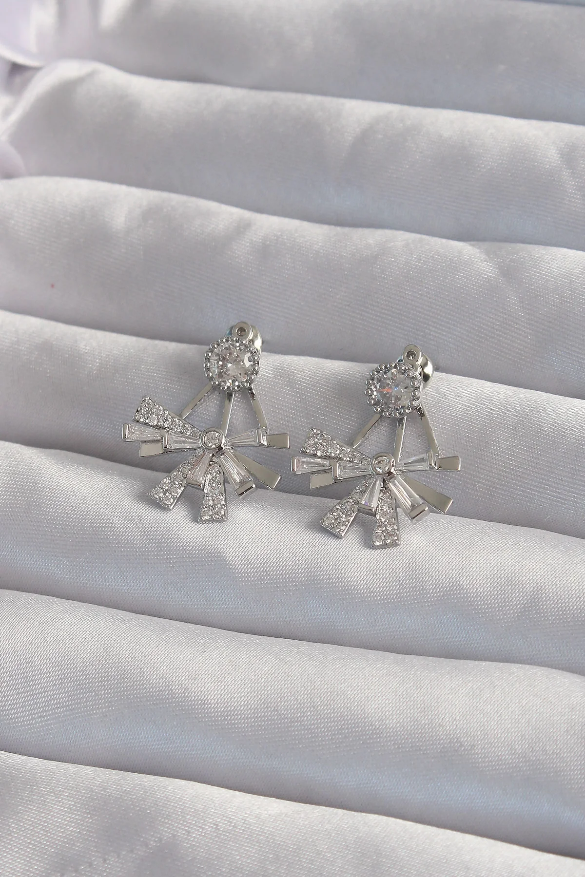 Pirinç Gümüş Renk Zirkon Taşlı Yassı Fiyonk Model Küpe