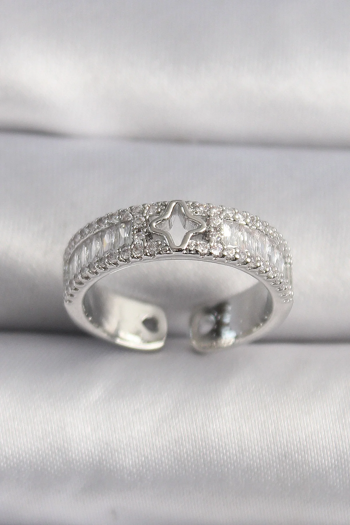 Pirinç Gümüş Renk Zirkon Taşlı Yıldız İşleme VIP Seri Kadın Yüzük