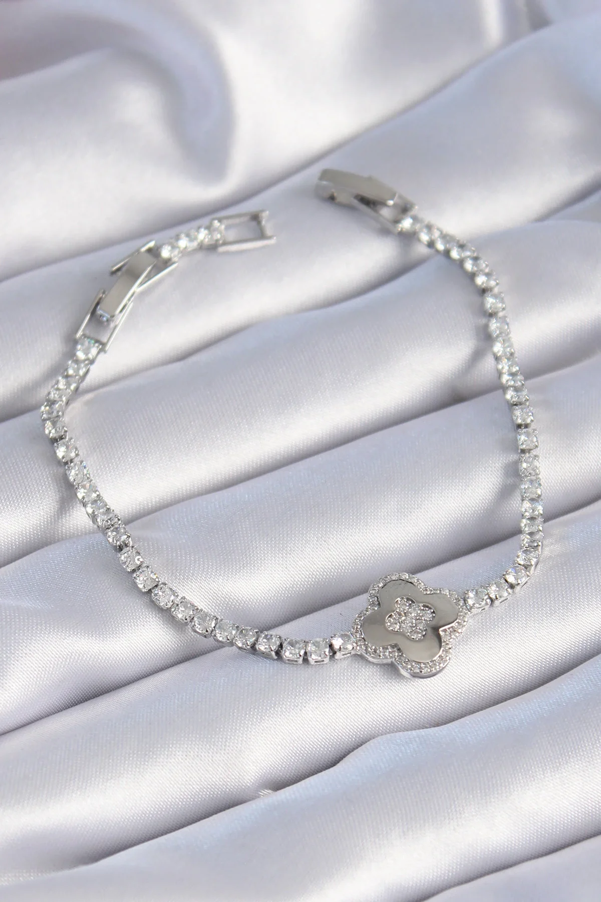 Pirinç Gümüş Renk Zirkon Taşlı Yonca Model Kadın Bileklik