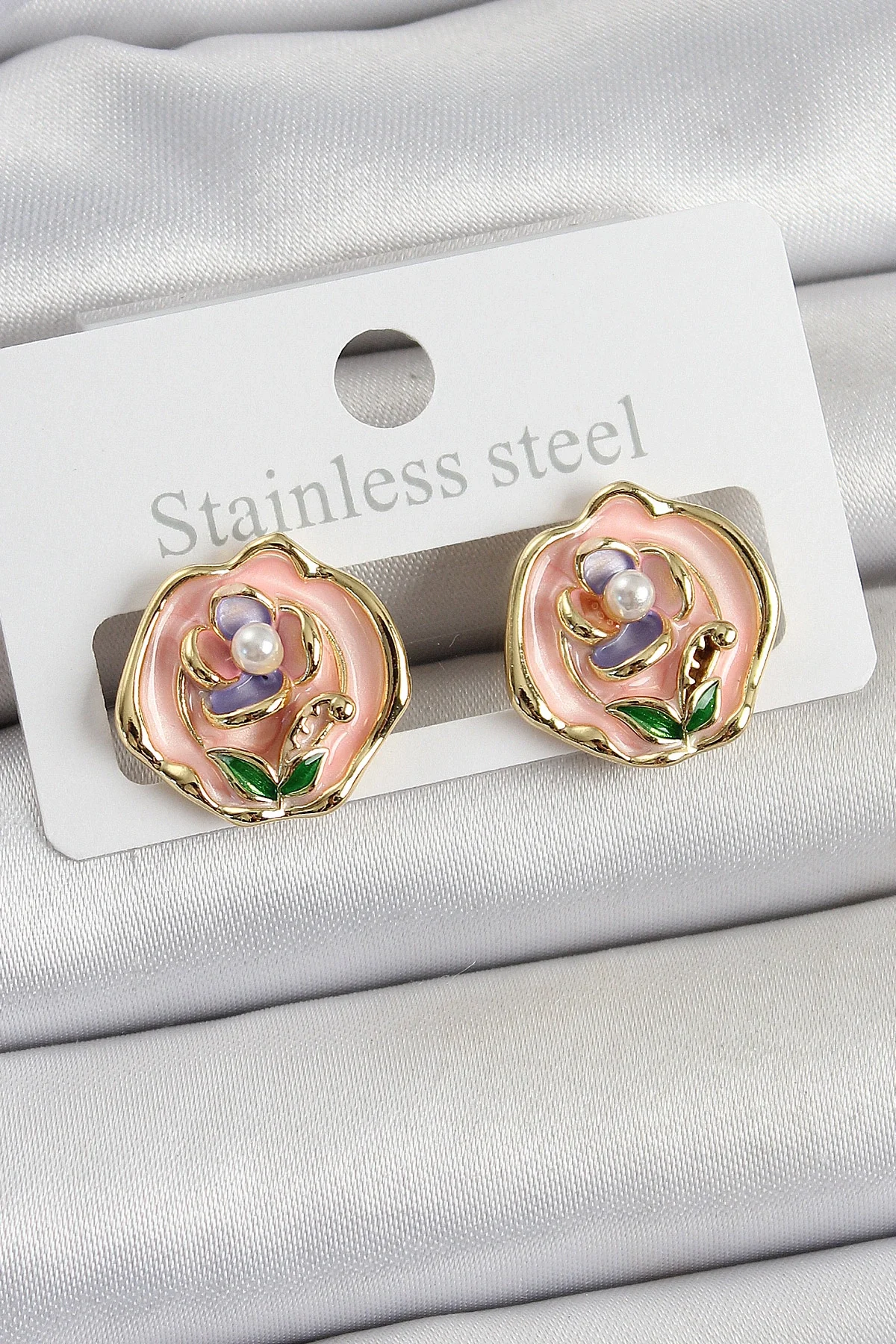 Pirinç Pembe Mineli Çiçek Figürlü Sanatsal Portre Model Gold Renk Kadın Küpe