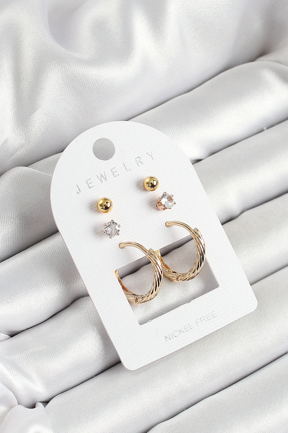 Pirinç Zirkon Taş Ve Halka Figürlü Gold Renk 3'lü Çift Kadın Küpe Set