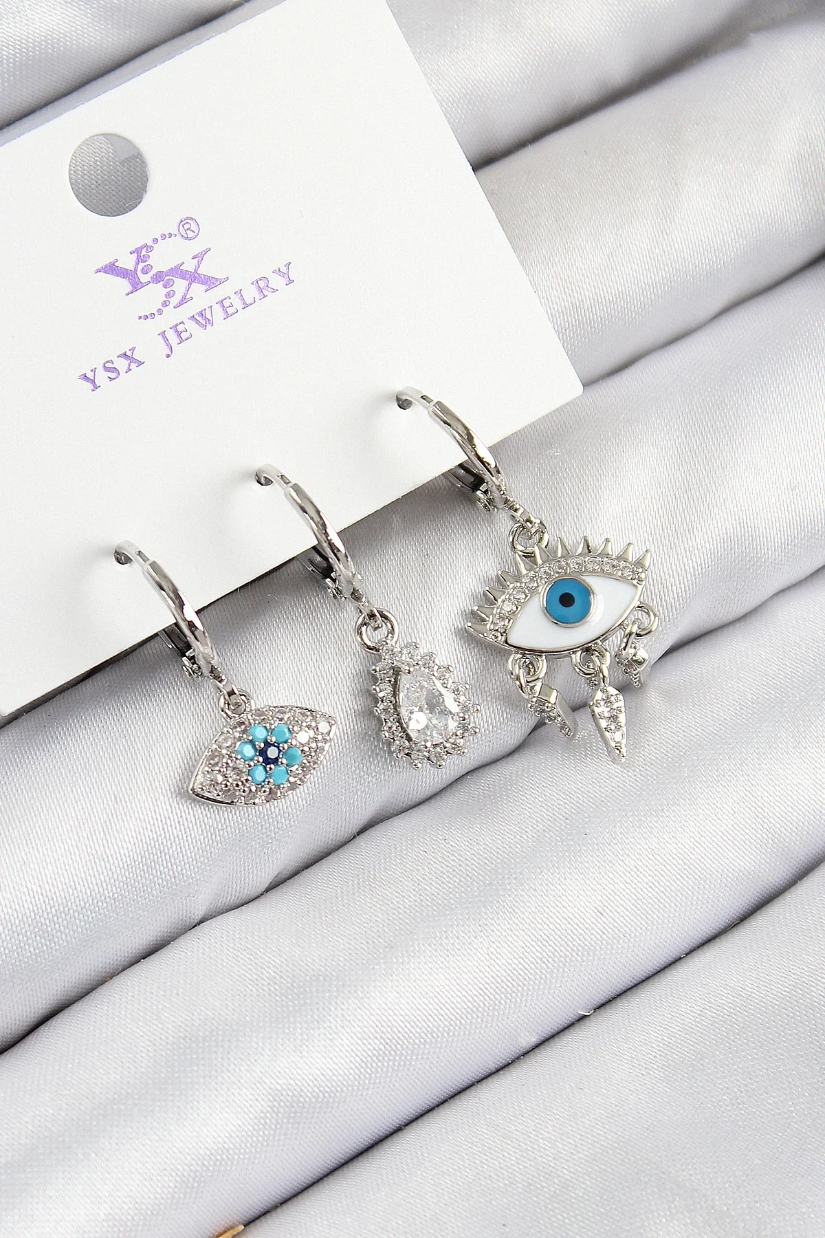 Pirinç Zirkon Taşlı 3'lü Fatma'nın Gözü Model Gümüş Renk Kadın Küpe
