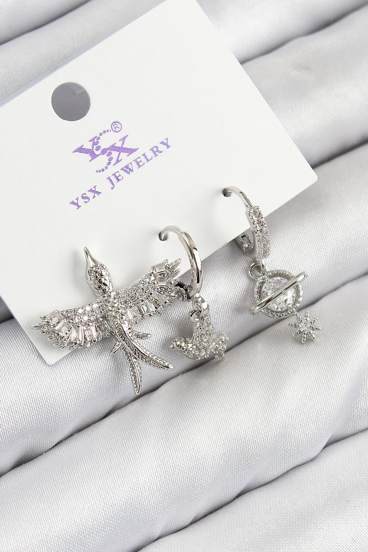 Pirinç Zirkon Taşlı 3'lü Kuş Model Gümüş Renk Kadın Küpe