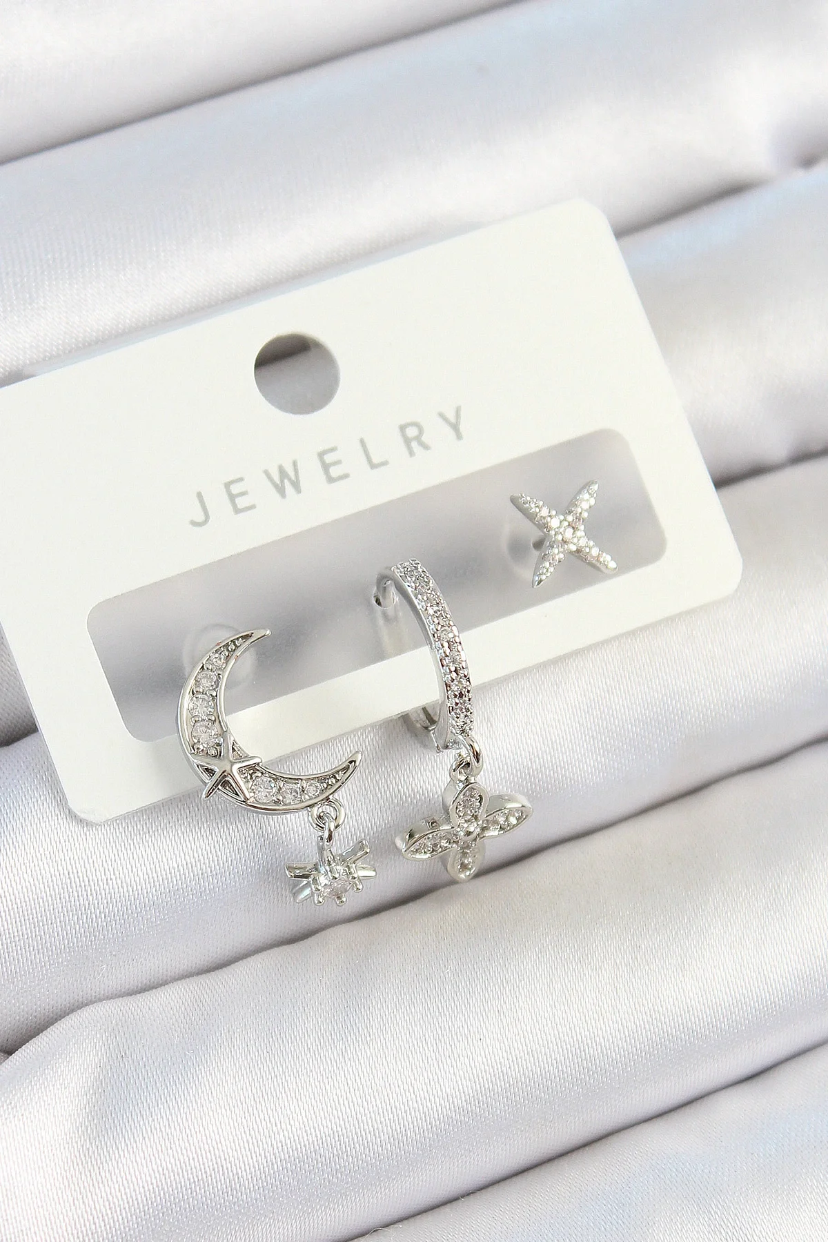 Pirinç Zirkon Taşlı Çiçek Ve Ay Model Gümüş Renk 3'lü Çift Kadın Küpe Set