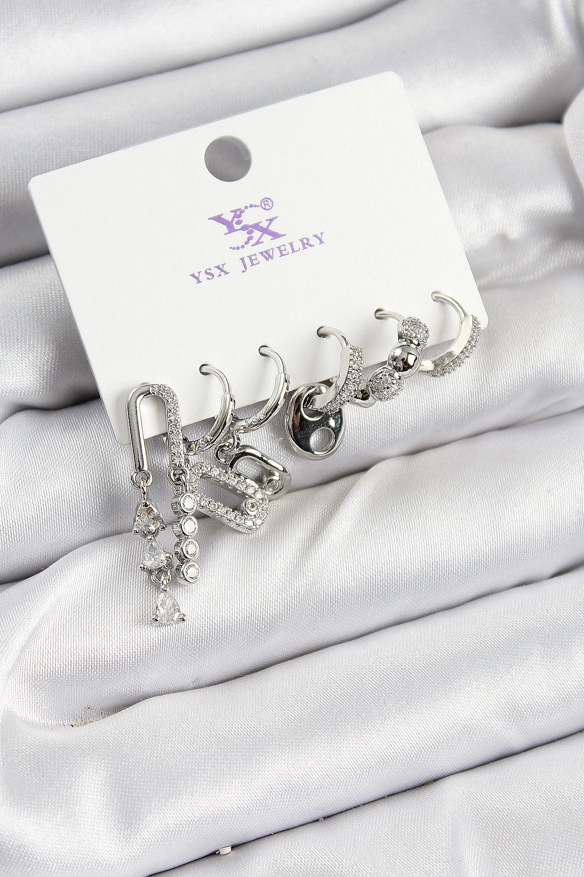 Pirinç Zİrkon Taşlı Dikdörtgen Model Gümüş Renk 3'lü Çift Kadın Küpe