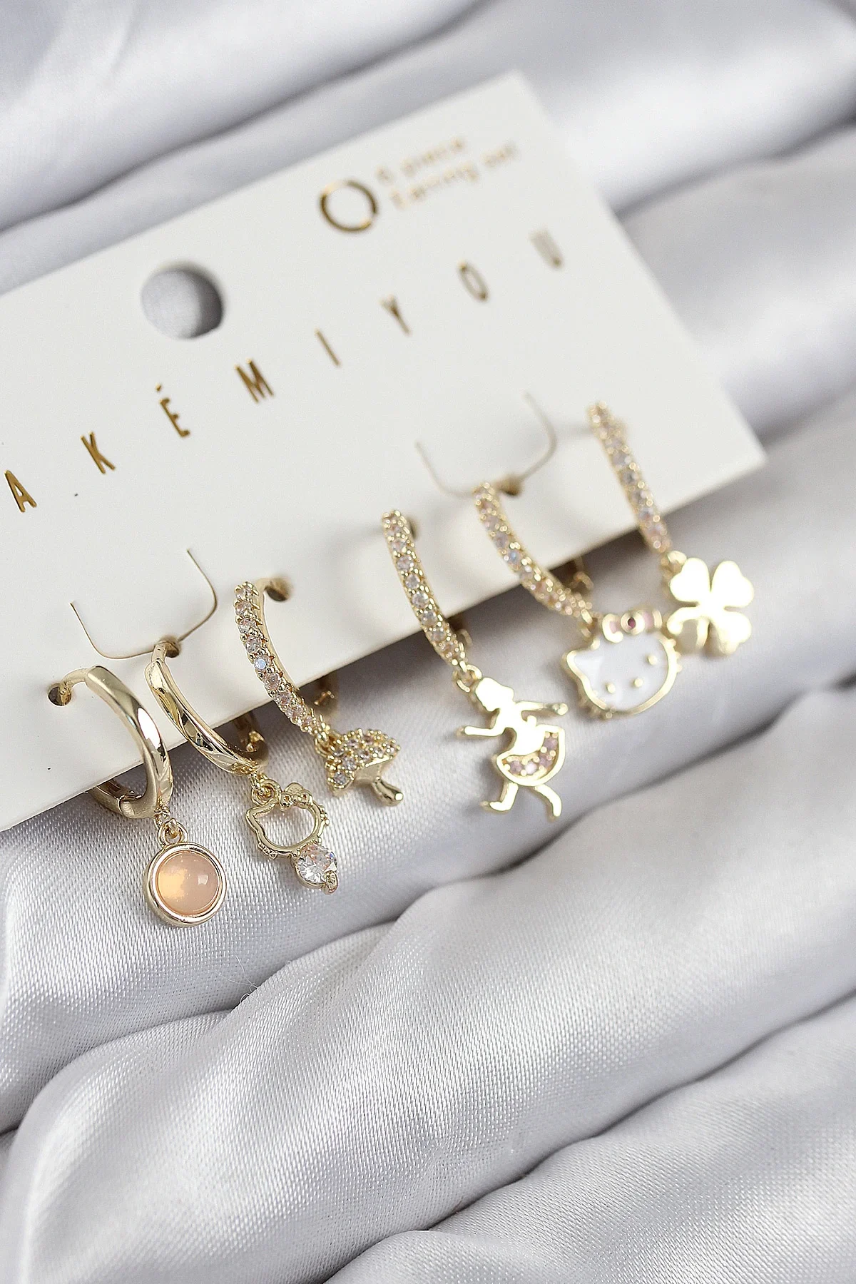 Pirinç Zirkon Taşlı Hello Kity Ve Yonca Model Gold Renk 6'lı Küpe Set