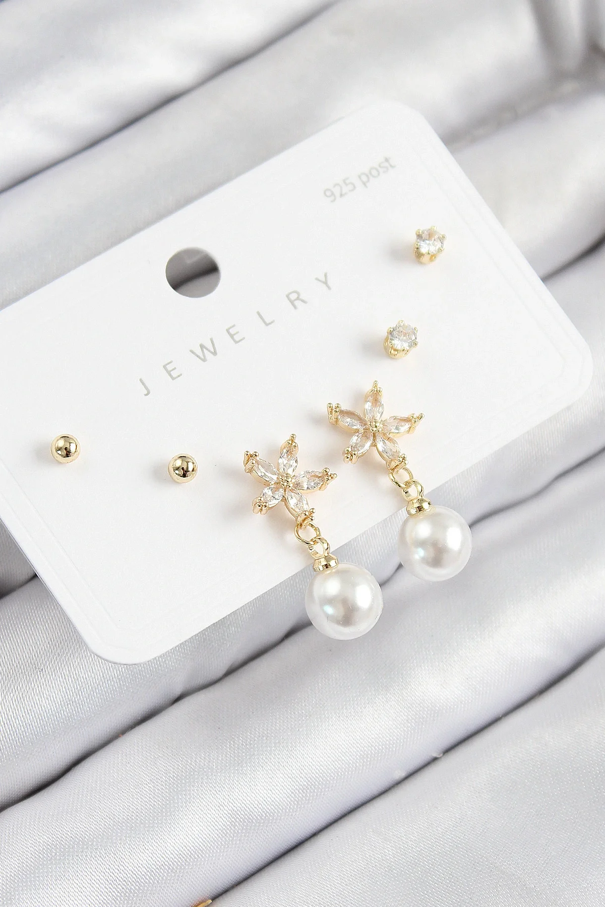 Pirinç Zirkon Taşlı İnci Sallantılı Çiçek Model Gümüş Renk 925 Ayar Gümüş Çivi Kadın Küpe Set