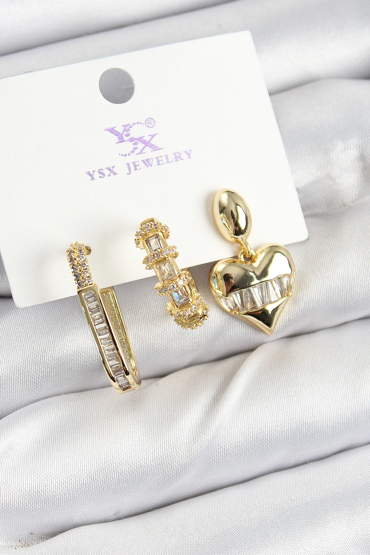 Pirinç Zİrkon Taşlı Kalp Model Gold Renk 3'lü Kadın Küpe