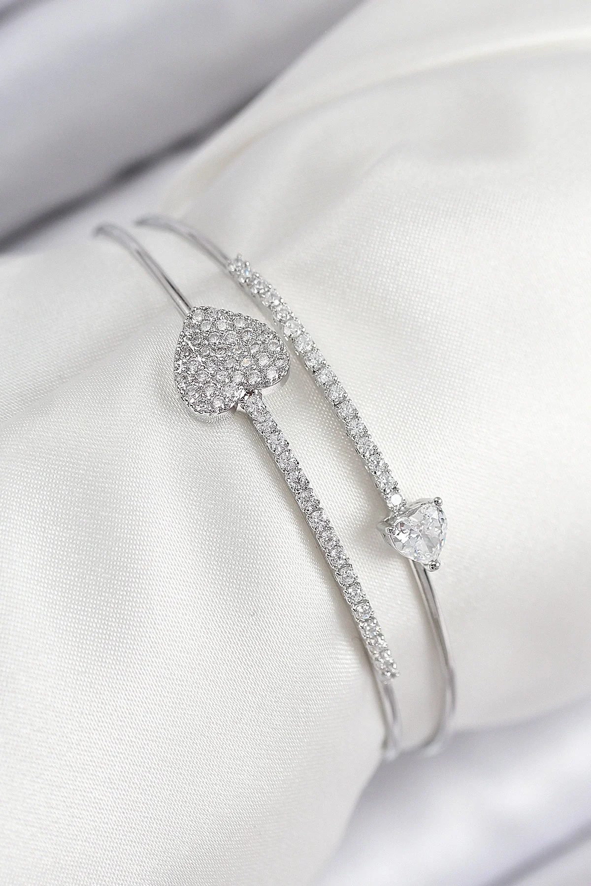 Pirinç Zirkon Taşlı Kalp Model Gümüş Renk Kadın Bileklik