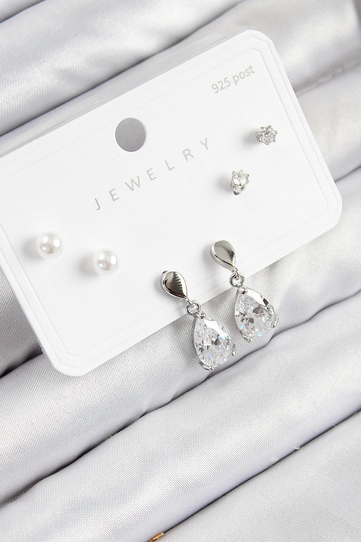 Pirinç Zirkon Taşlı Sallantılı Damla Model Gümüş Renk 925 Ayar Gümüş Çivi Kadın Küpe Set