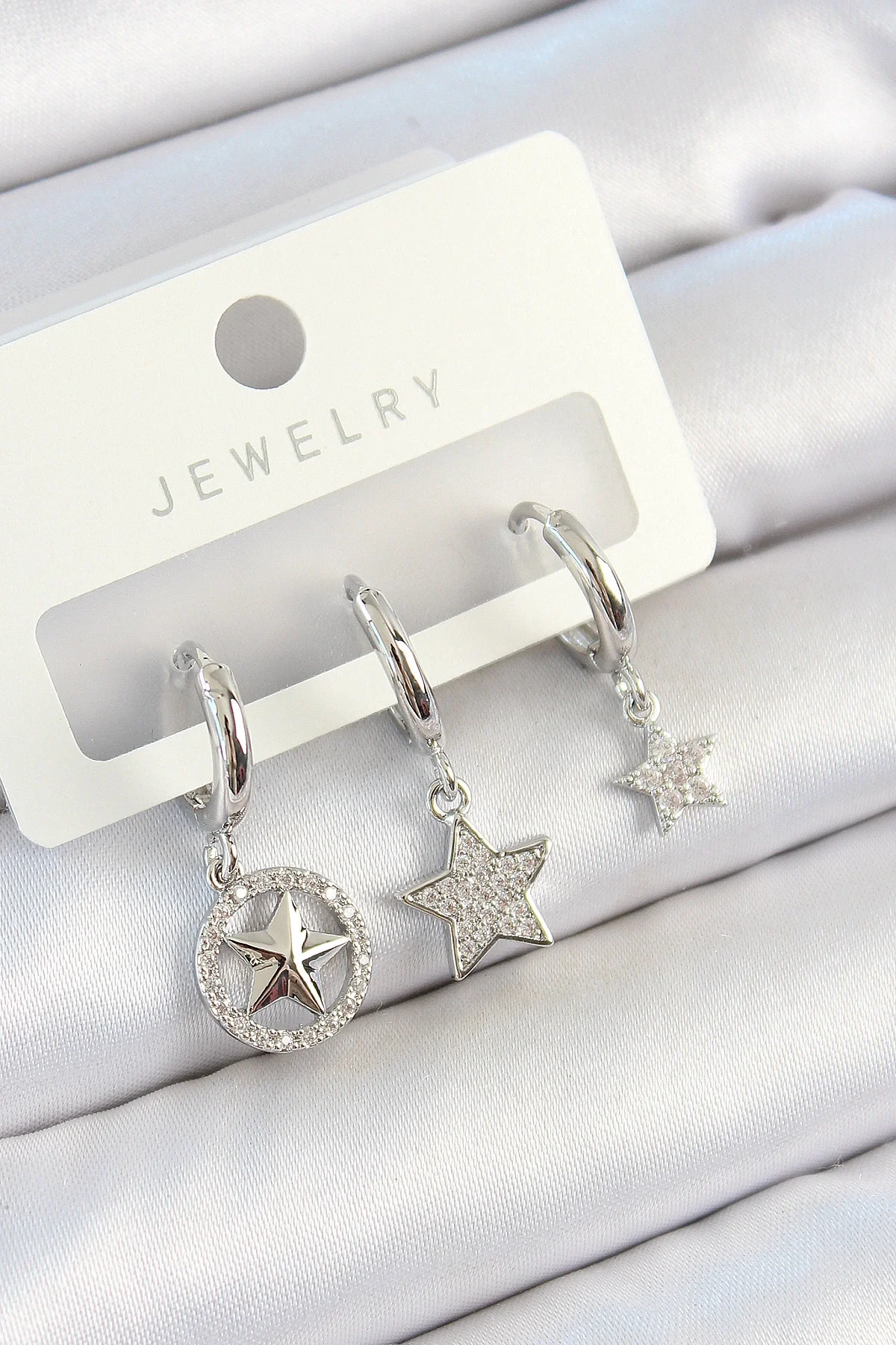 Pirinç Zirkon Taşlı Yıldız Model Gümüş Renk 3'lü Çift Kadın Küpe Set