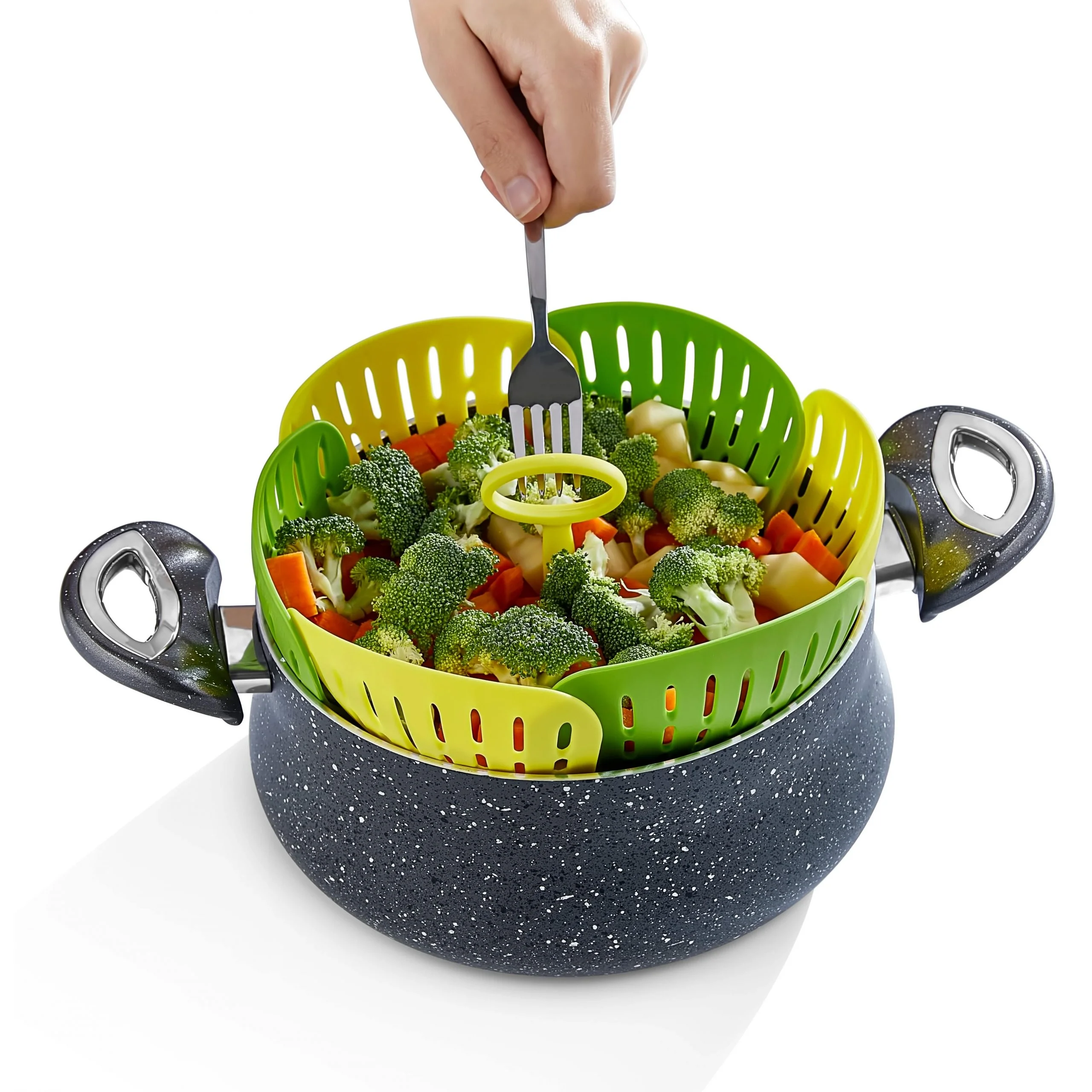 Sebze haşlama sepetine sebzeleri koyun ve tencereye yerleştirin, delikleri sayesinde sebzeleriniz buharda sağlıklı ve mükemmel şekilde pişsin!