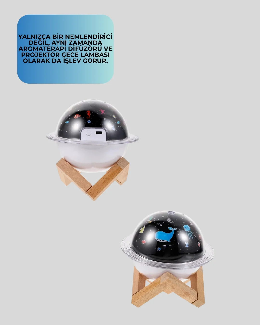 Projektör ışıklı ve aromaterapi destekli taşınabilir nemlendirici cihaz USB bağlantılı