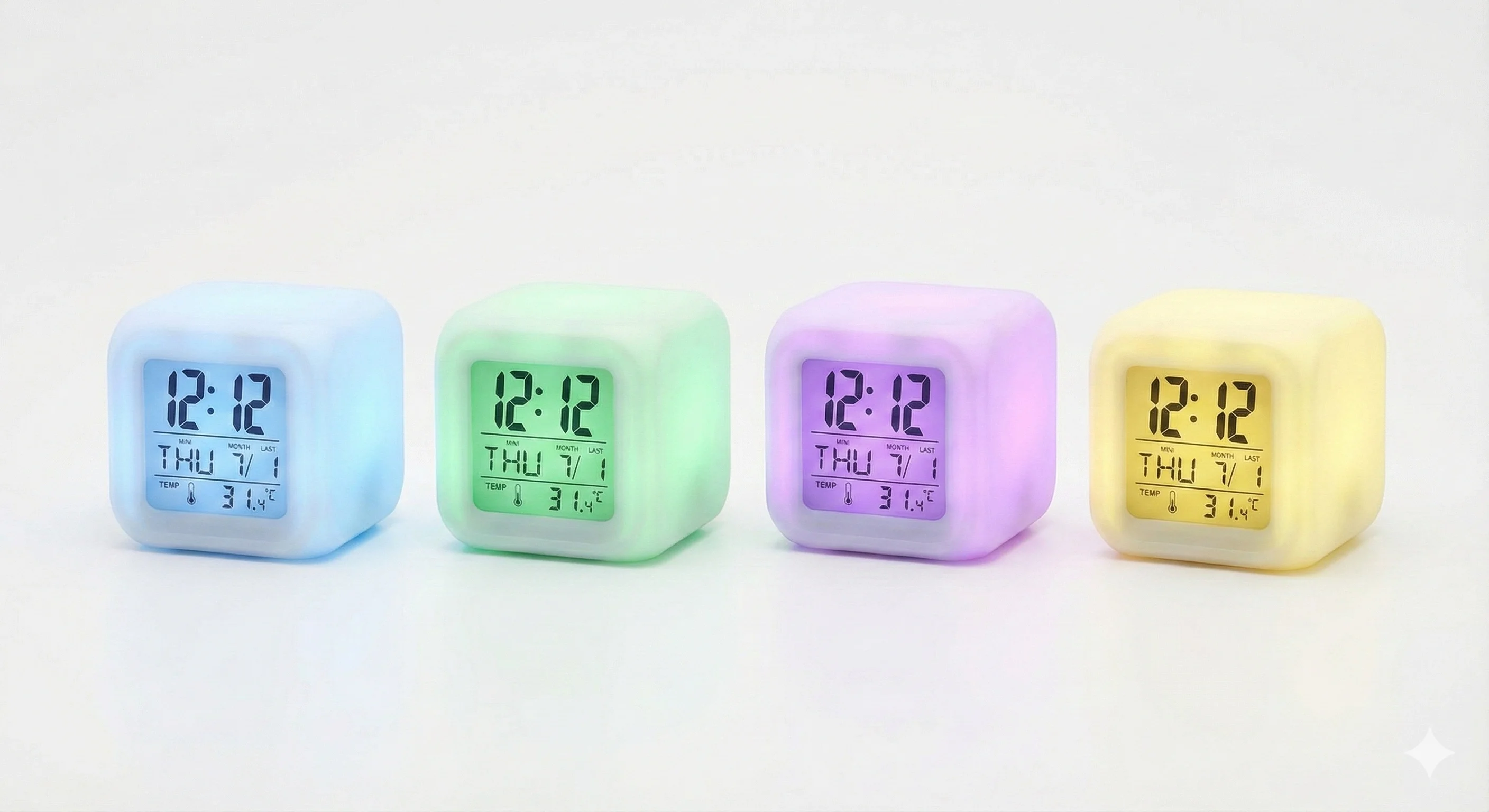 Sürekli değişen 7 renkli güçlü LED ışığıyla odanıza gökkuşağını getirecek! Hem bir gece lambası hem de bir terapist! Etrafına verdiği ışık ve rengi gördükten sonra sıradaki renge geçmesi için sizin de sabırsızlıkla bekleyeceğiniz şüphesiz. Gece saati görmek için dokunmanız yeterli.Tüm gövdesi ve ekranı ile birlikte renk değiştirmektedir. Işığını yakmadan da kullanabilirsiniz. Renk Değiştirebilen Masa Saati + Termometre + Alarm İsterseniz 7 farklı rengi sürekli değiştirebilen çok hoş bir gece lambası! İsterseniz İki farklı seçenekte renk değiştirebilen masa saati! Sürekli olarak renk değiştirir ya da dilerseniz sadece dokunduğunuzda! Gece saatinizi görmek için dokunmanız yeterli! Tüm gövdesi ve ekranı ile birlikte renk değiştirmektedir! Işığını yakmadan da kullanılabilir! 4 adet ince kalem pil (AAA) ile çalışır. (Piller pakete dahil değildir) Teknik Özellikleri: 12/24 Formatlı dijital saat. Snooze (Şekerleme!) özellikli, müzikli alarm. Termometre (C/F alternatifli) Takvim Doğum günü hatırlatıcı.