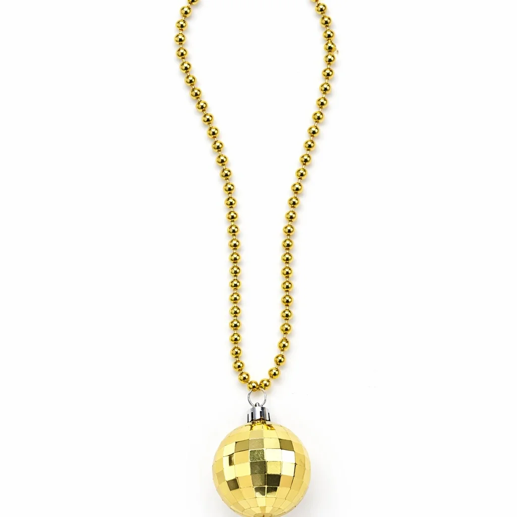 Kolye ucundaki disko topu tasarımı klasik dans pistlerinin enerjisini yansıtır ve retro tarz sevenler için eğlenceli bir görünüm oluşturur. Kostüm kombinlerini tamamlayan ve dikkat çeken bir parti aksesuarıdır.