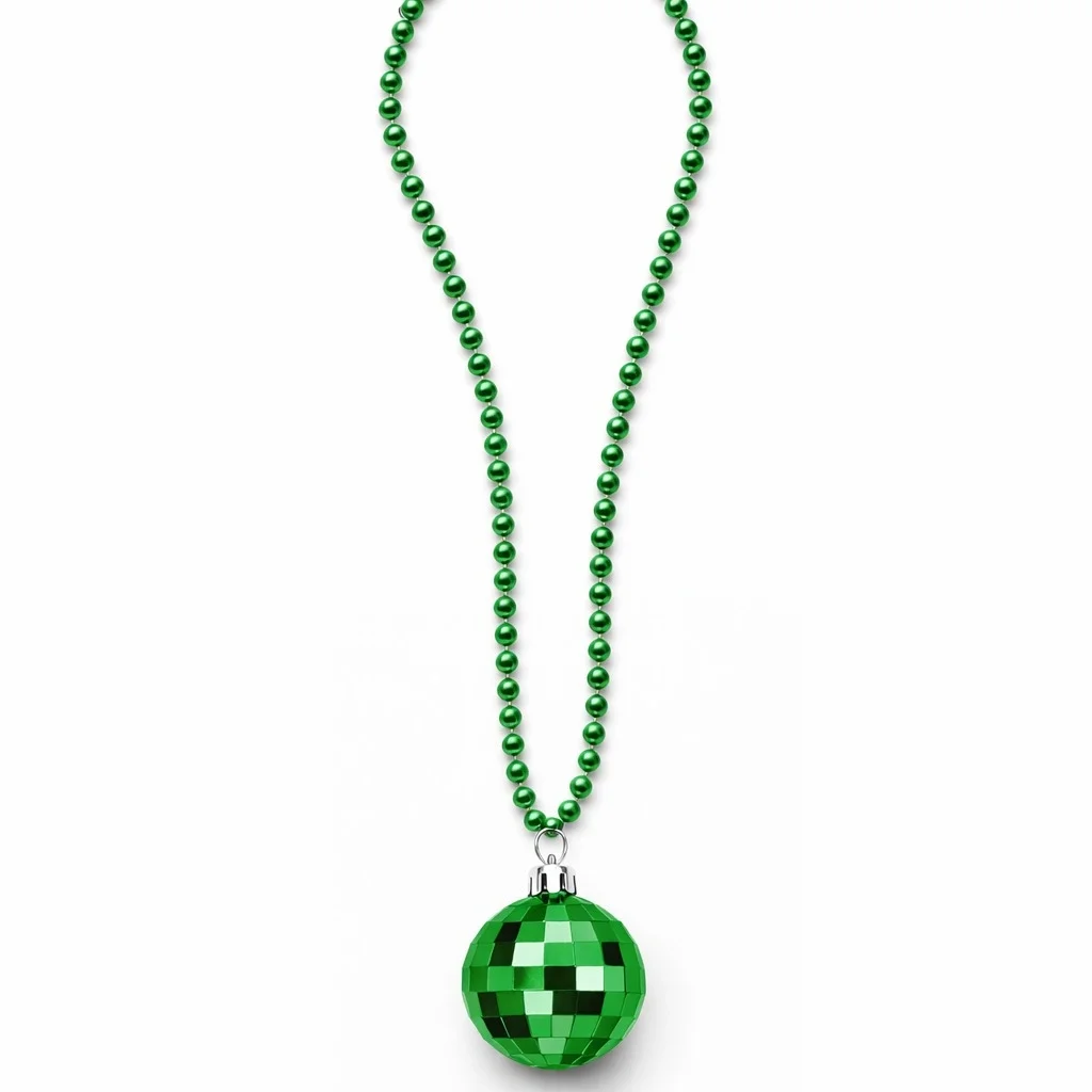 Kolye ucundaki disko topu tasarımı klasik dans pistlerinin enerjisini yansıtır ve retro tarz sevenler için eğlenceli bir görünüm oluşturur. Kostüm kombinlerini tamamlayan ve dikkat çeken bir parti aksesuarıdır.