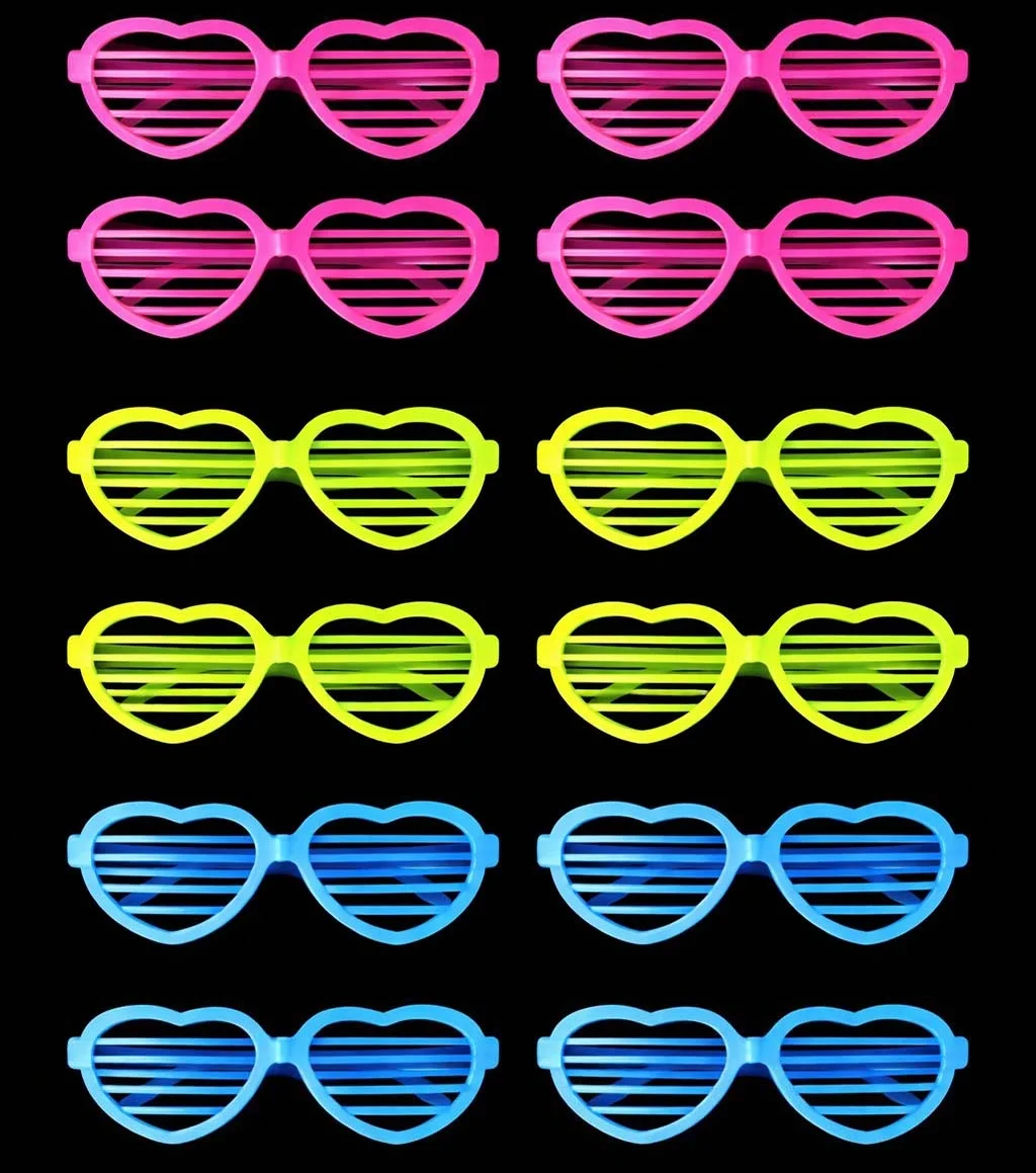 Fosforlu Kalp Panjur Gözlük, neon renkleri ve eğlenceli tasarımıyla parti ve organizasyonların vazgeçilmez aksesuarıdır. Kalp formundaki panjur yapısı sayesinde klasik gözlüklerden ayrılır ve özellikle karanlık ortamlarda fosforlu yapısıyla dikkat çeker.