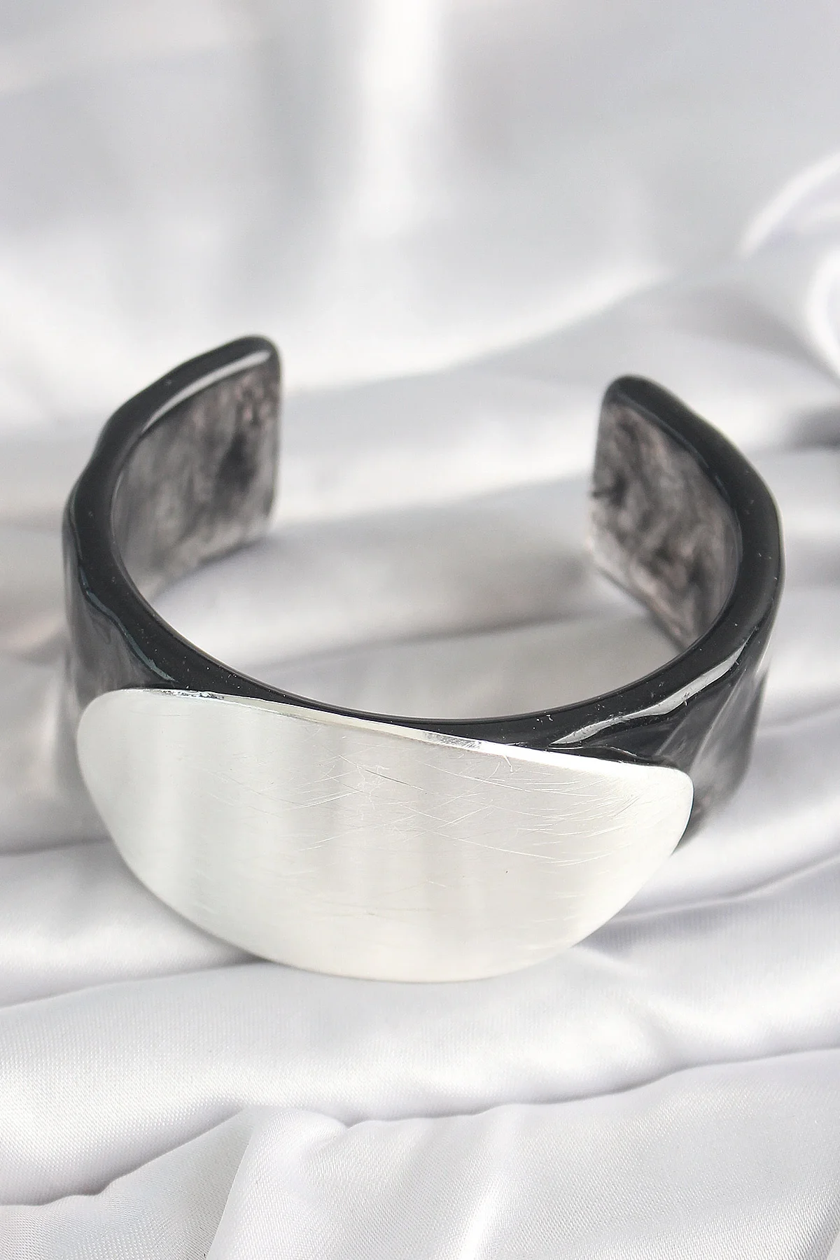 Siyah Mermer Desen Akrilik Plastik Gümüş Oval Plaka Model Vintage Kadın Bilezik