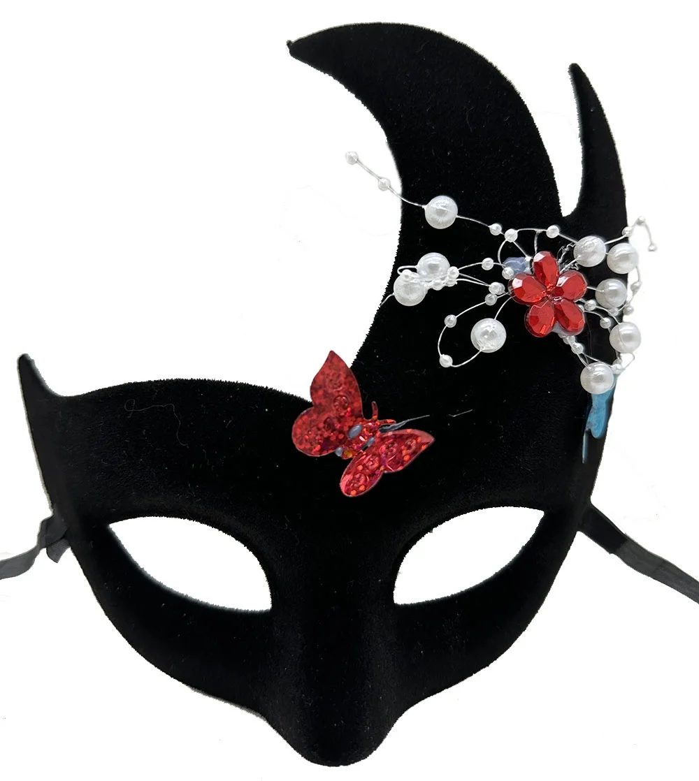 - Siyah süet kaplama ve inci ve taşlarla süslenmiş göz alıcı bir Venedik maskesi tasarımı.
