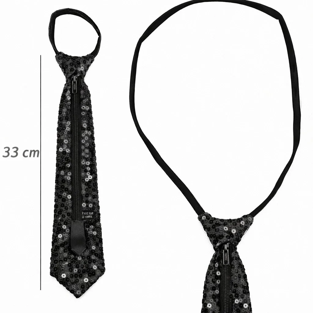 Siyah payetli fermuarlı parti kravatı; sahne performansları, doğum günü organizasyonları, yılbaşı partileri, konsept etkinlikler ve eğlence geceleri için tasarlanmıştır. Parlak payet yüzeyi ışık altında dikkat çekici bir ışıltı sağlar ve klasik siyahın asil duruşunu modern bir dokunuşla birleştirir.