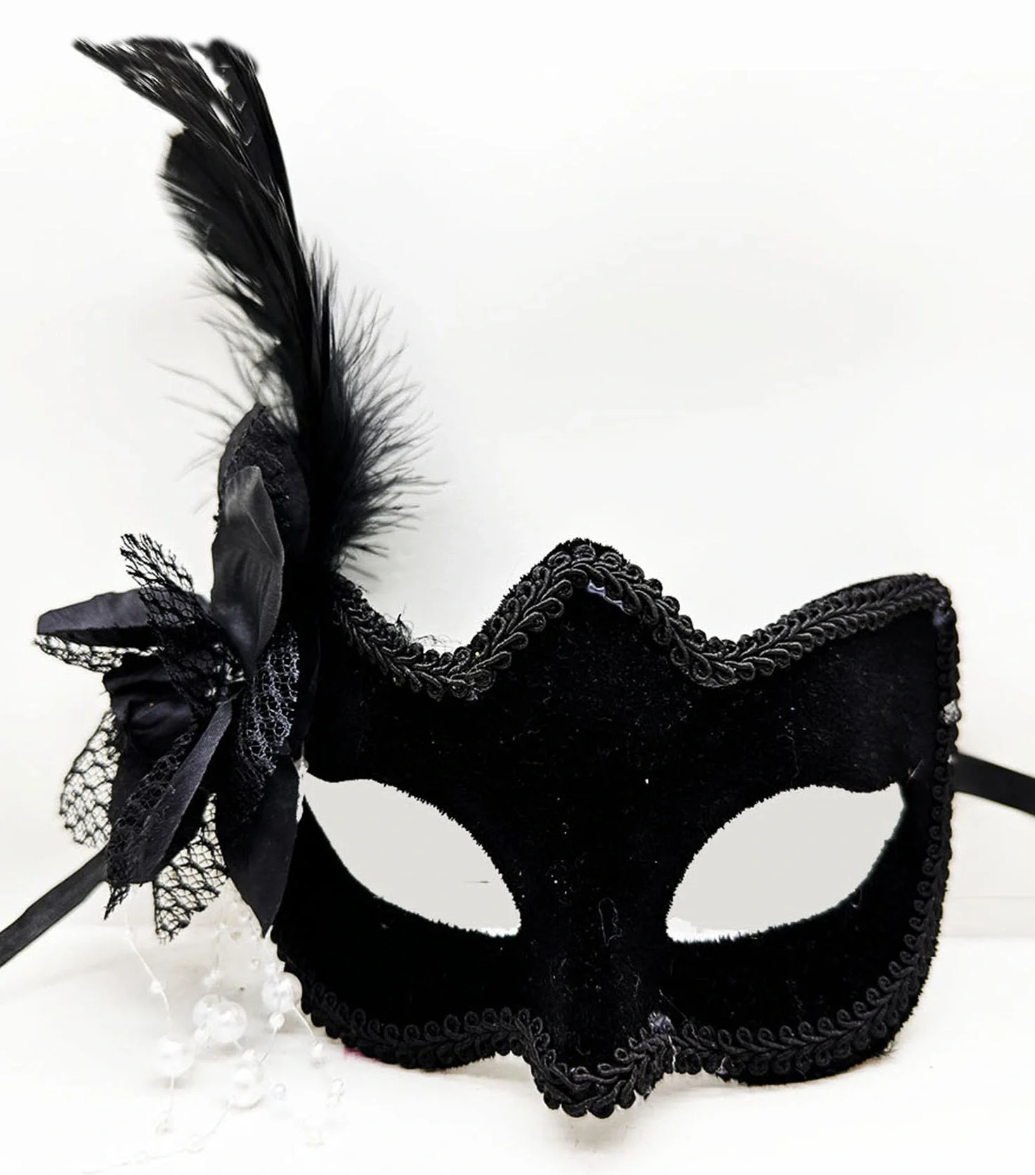 Siyah Renk Süet Kaplama Yandan Tüylü Beyaz İncili Parti Maskesi, balolar, maskeli partiler gibi özel günlerde gizemli ve göz alıcı bir görünüm elde etmek isteyenler için mükemmel bir seçimdir. Yumuşak süet kaplaması ve zarif beyaz incileri ile bu maske sizi partinin yıldızı yapacak.