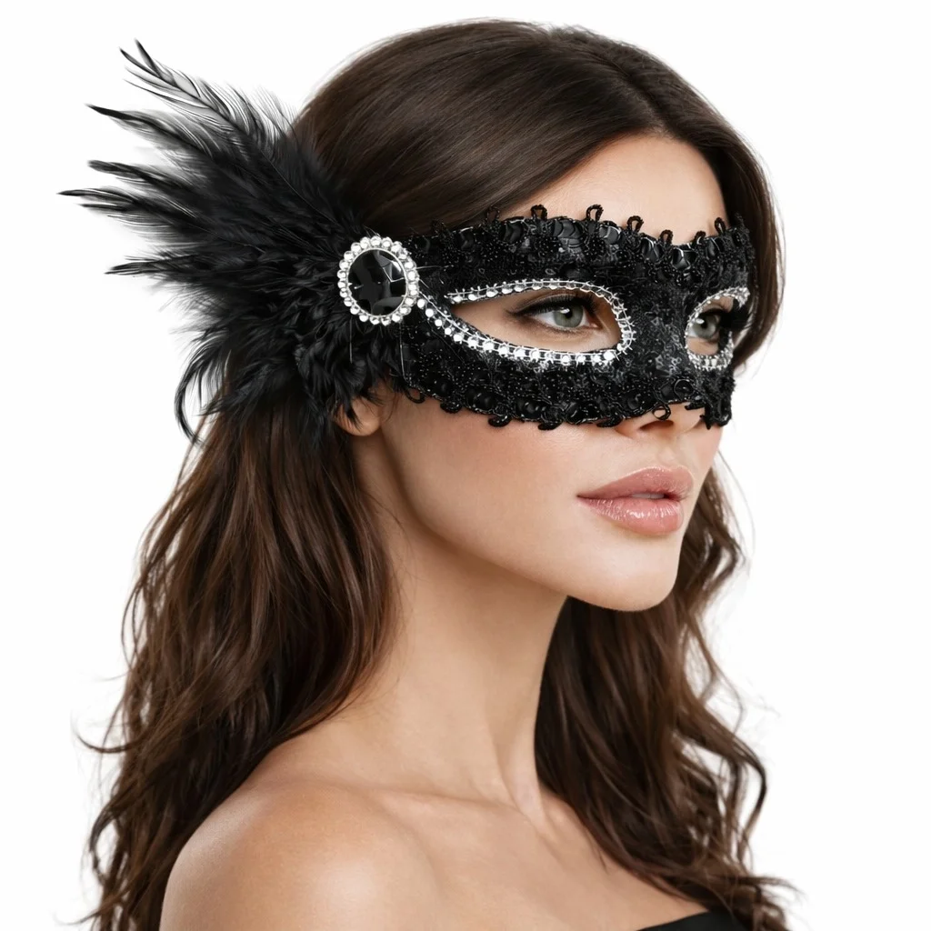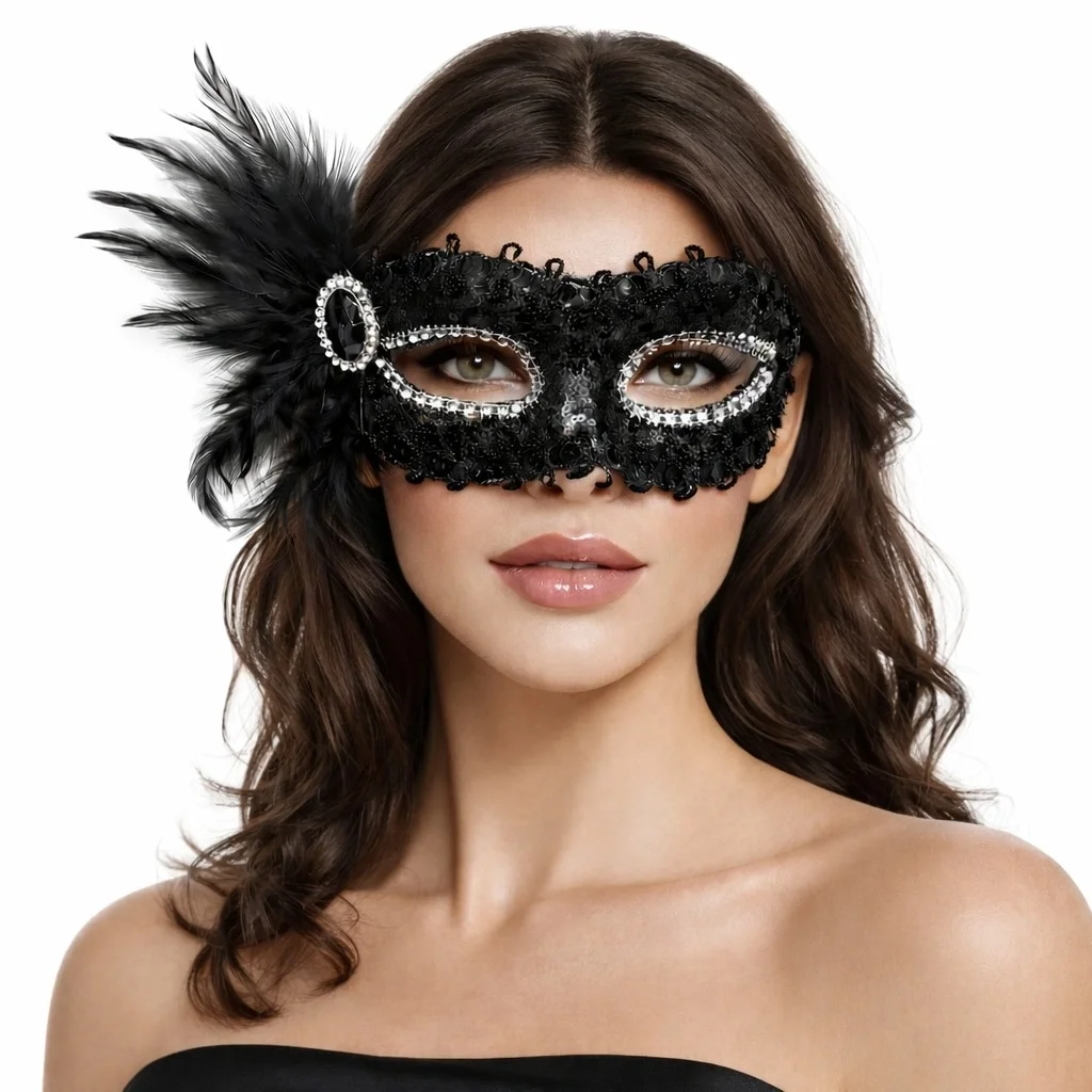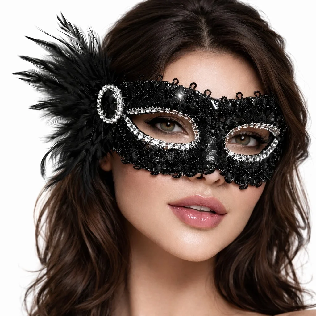 Şıklığın ve gizemin buluştuğu taş ve tüy detaylı siyah maskeli balo maskesi, özel davetlerinizde fark yaratmanız için tasarlandı. Parlak payet kaplama yüzeyi, göz çevresindeki taş işlemeleri ve yan kısımdaki zarif siyah tüy detayı ile son derece dikkat çekici bir görünüm sunar.