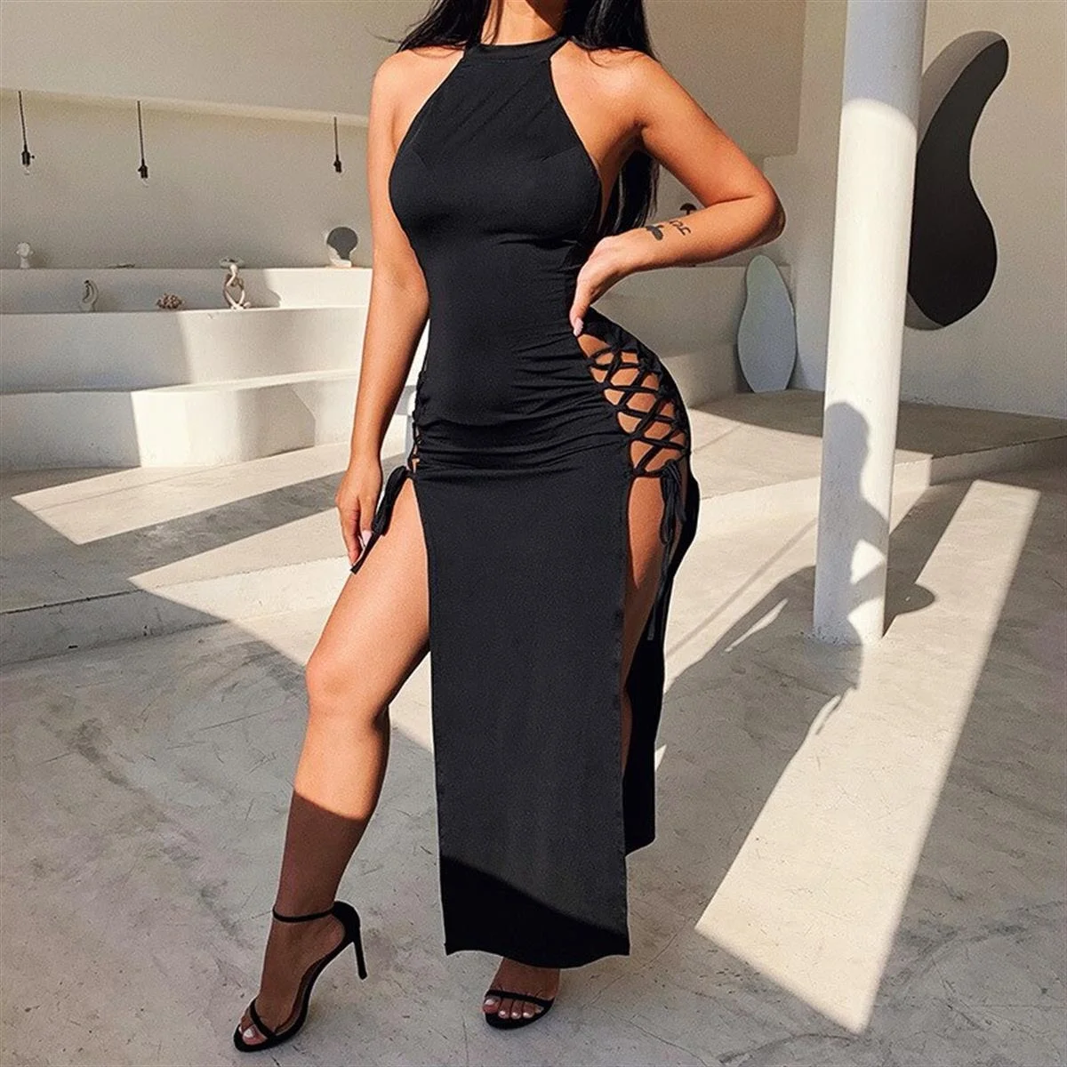 Esnek likralı dabany kumaştan üretilmiş derin yırtmaçlı elbise. Fantazi giyim ve gece giyim sevenler için klasik bir tercih. Vücudunuzu sarar ve müthiş bir görünüm elde edersiniz.