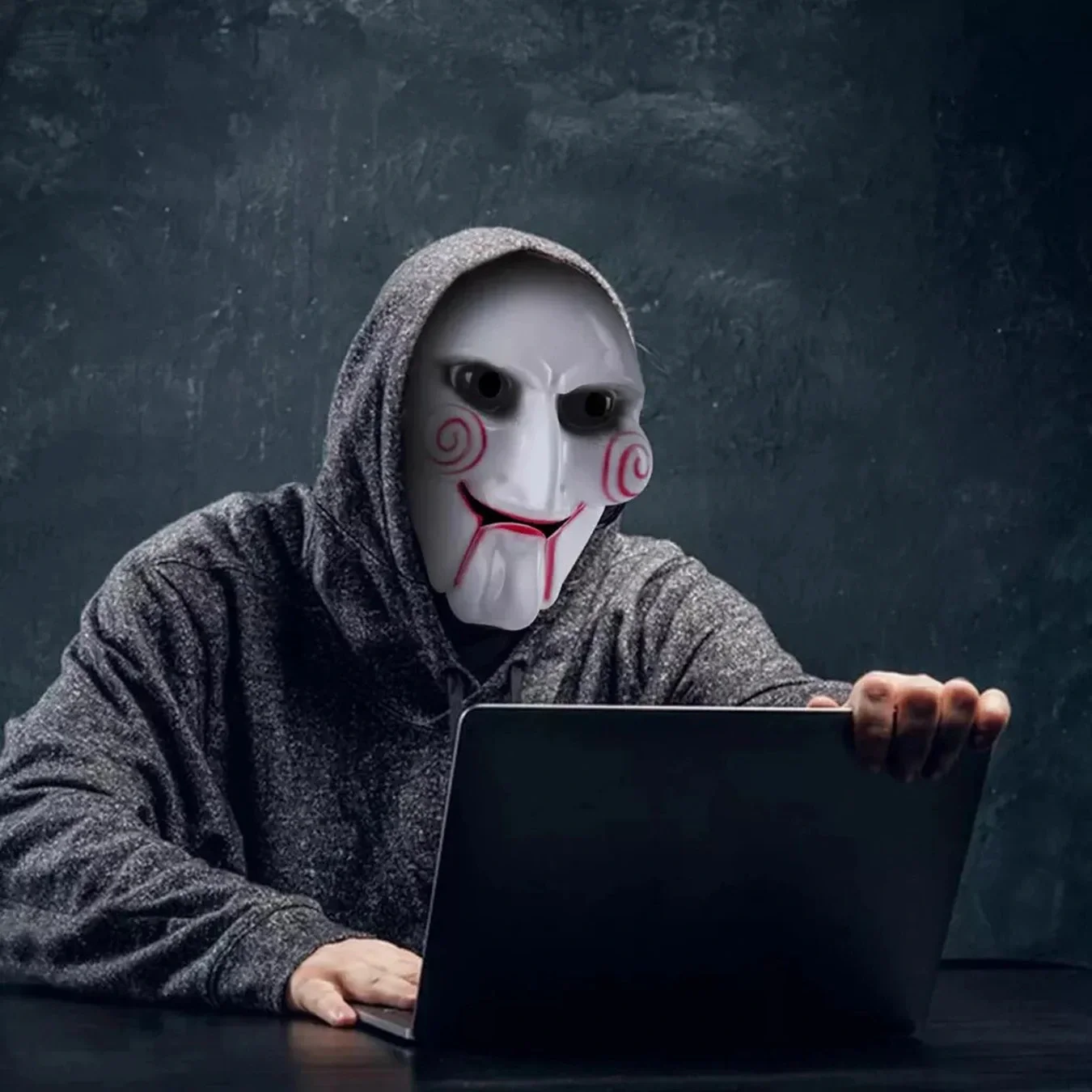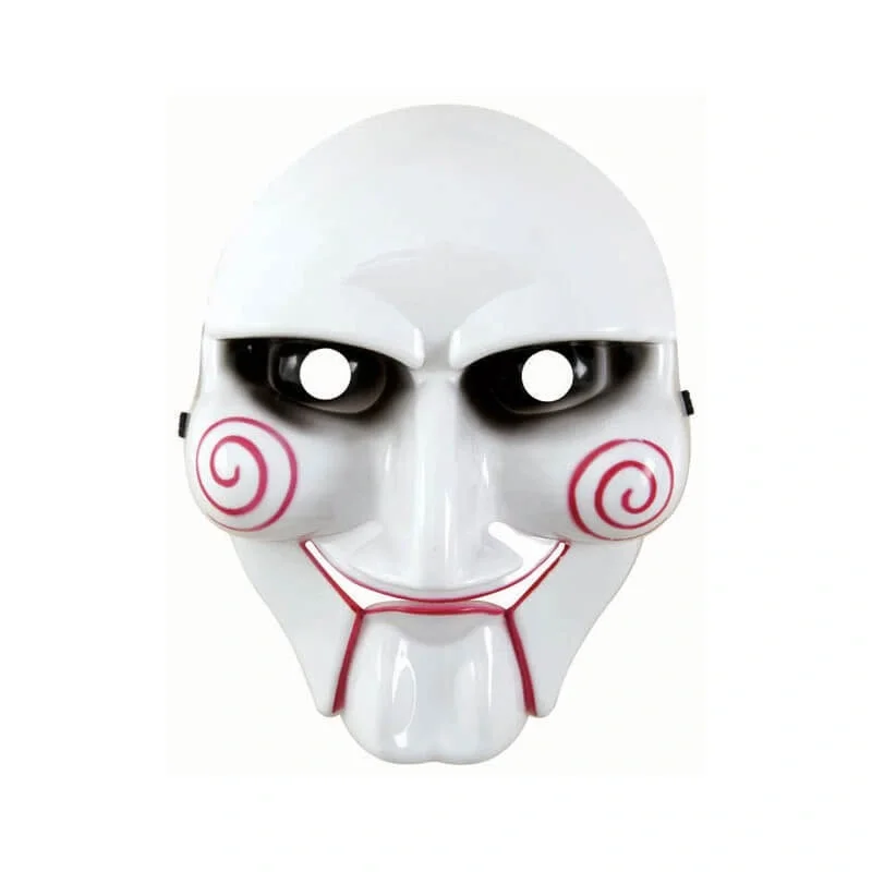 Yetişkinler ve Çocuklar için Parçalı maske siyah elastik sert plastik ve yapışması yapılmıştır. Siyah göz bölgesi, kırmızı ağız bölgesi ve yanaklarda kırmızı spirallerle beyazdır. Bu testere maskesi bir kukla kafasına benziyor, bir Cadılar Bayramı partisi için orijinal bir şekilde giyinmek için mükemmel .