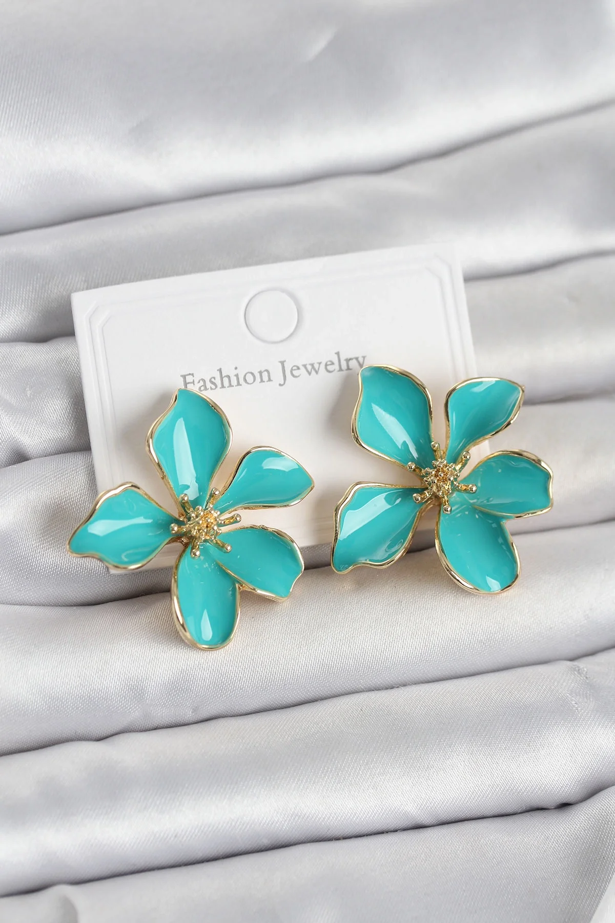 Turkuaz Mineli Çiçek Model Pirinç Kadın Küpe