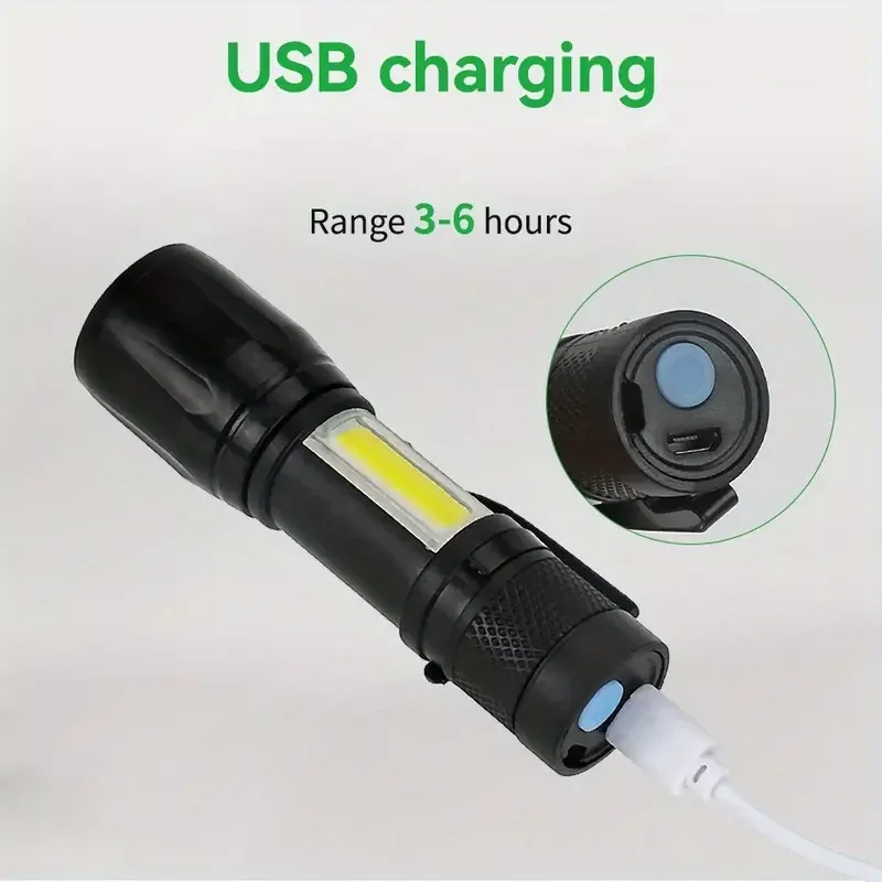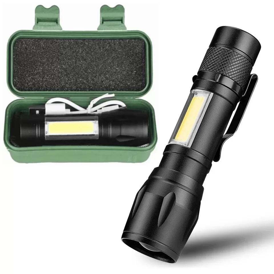Ultra Parlak Şarj Edilebilir LED El Feneri, COB Yan Işık, Yakınlaştırma ve Uzaktan Görüş Özelliği, Taktik Kullanım İçin Klipsli Tasarım, USB Şarj, Taşınabilir Tasarım, 30 Metre Menzil, 400 Lümen, ABS Malzeme, USB Kablosu Dahil