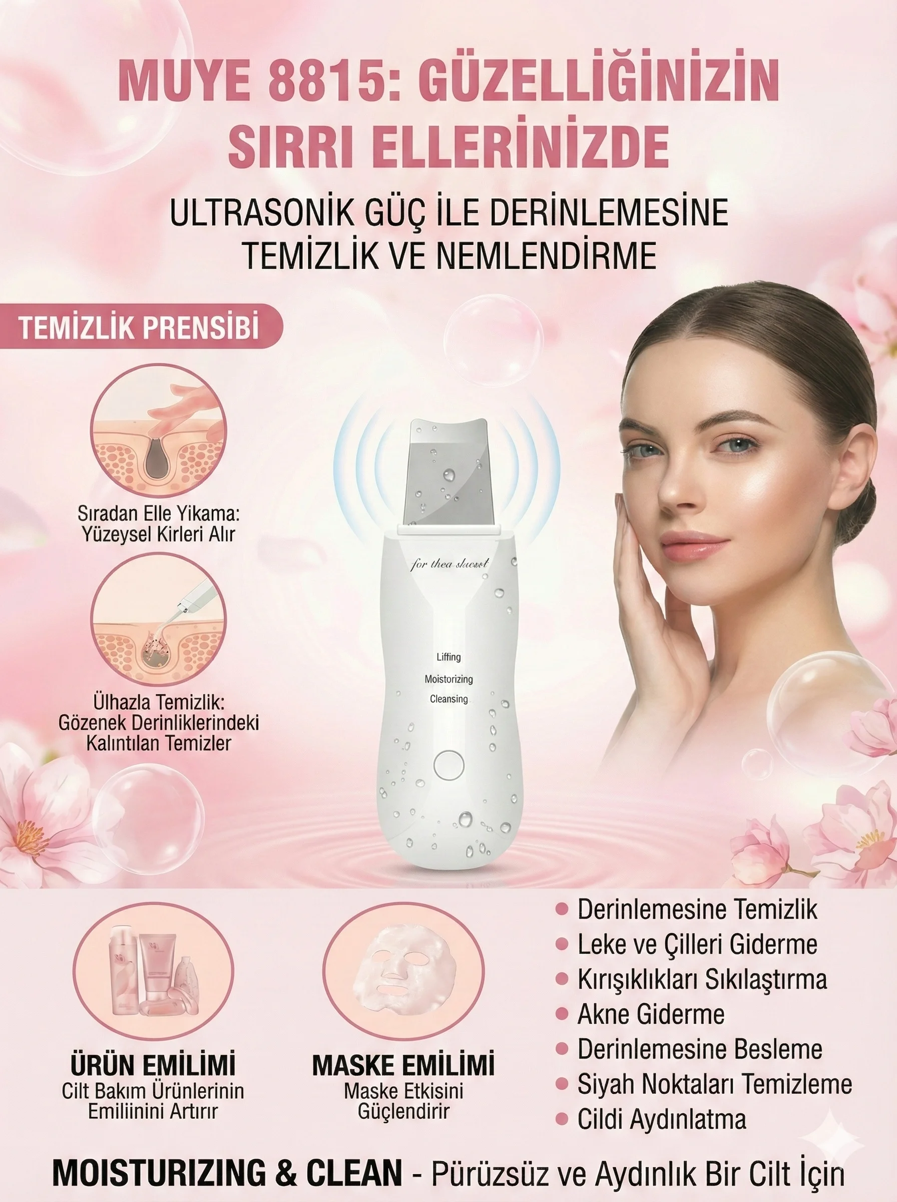 Lifting: Cilt Soyma Moisturizing: Cilt Nemlendirici Cleansing: Cilt Temizleme Kullanım: Yüzünüzü Suyla Temizleyin Yüzünüzü ıslak tutun ve ovalayın soyma moduna geçin, ovalama makinesini spatula bıçağı aşağı bakacak şekilde tutun, spatulanın kenarını cilt yüzeyi boyunca hafifçe kaydırın, gözeneklerden kolayca toparladığını izleyin spatulun kenarına taşar