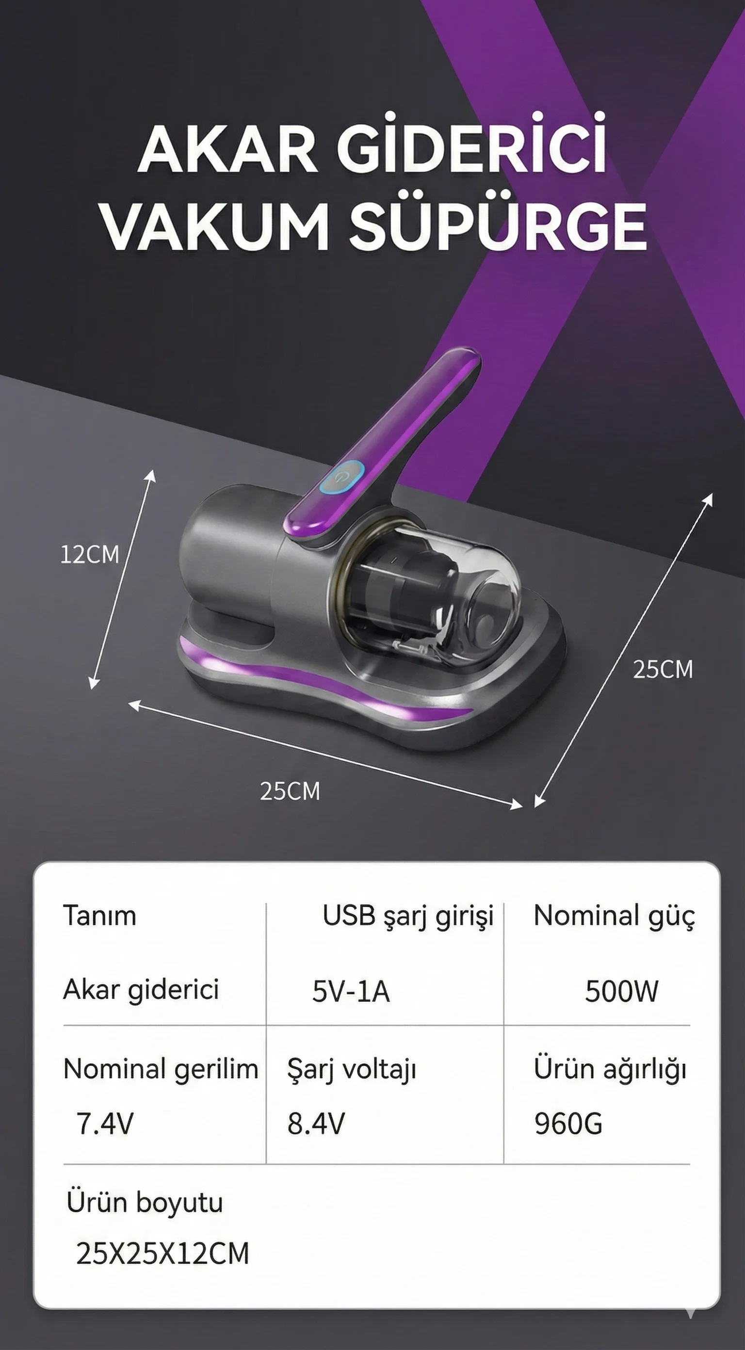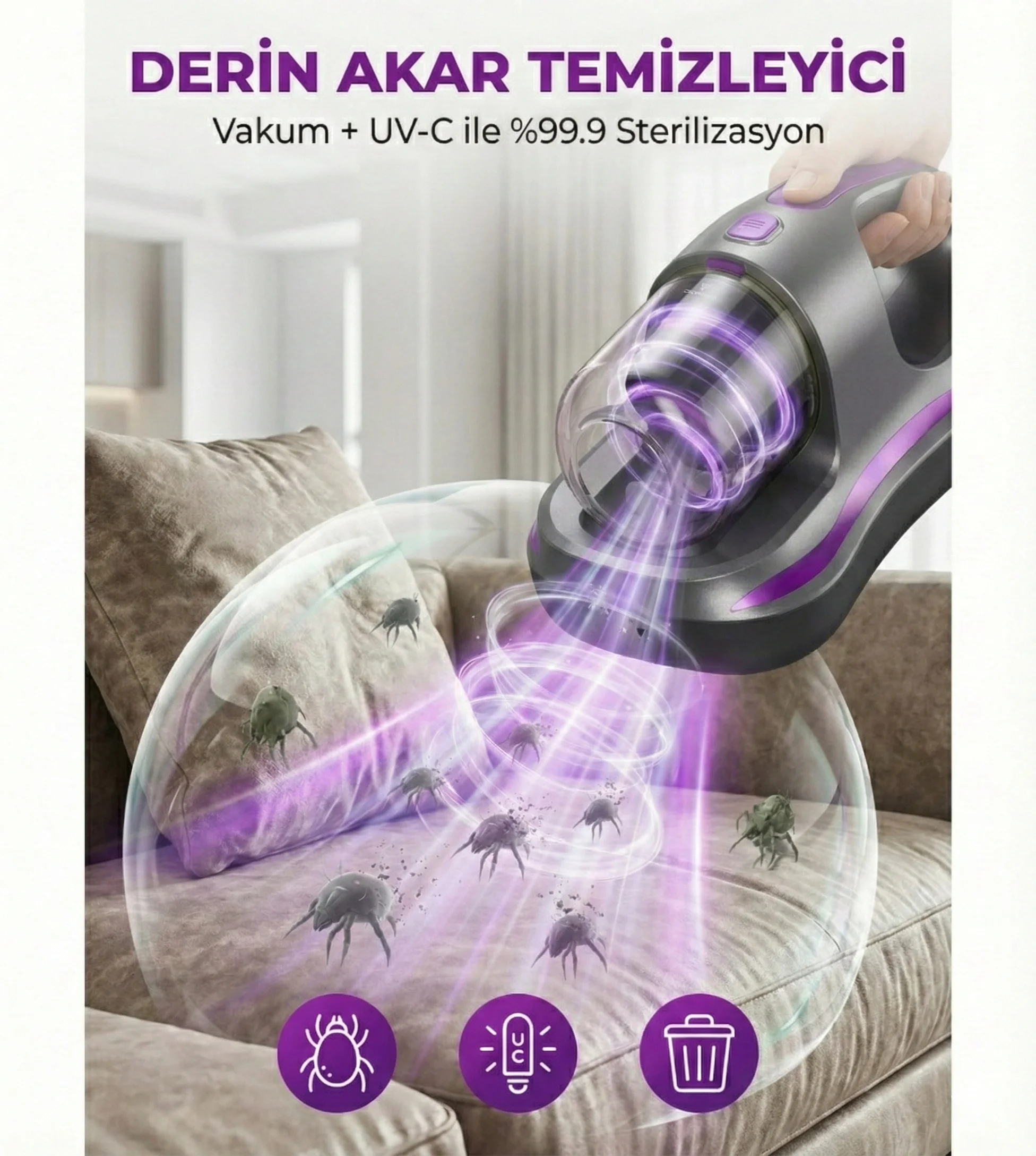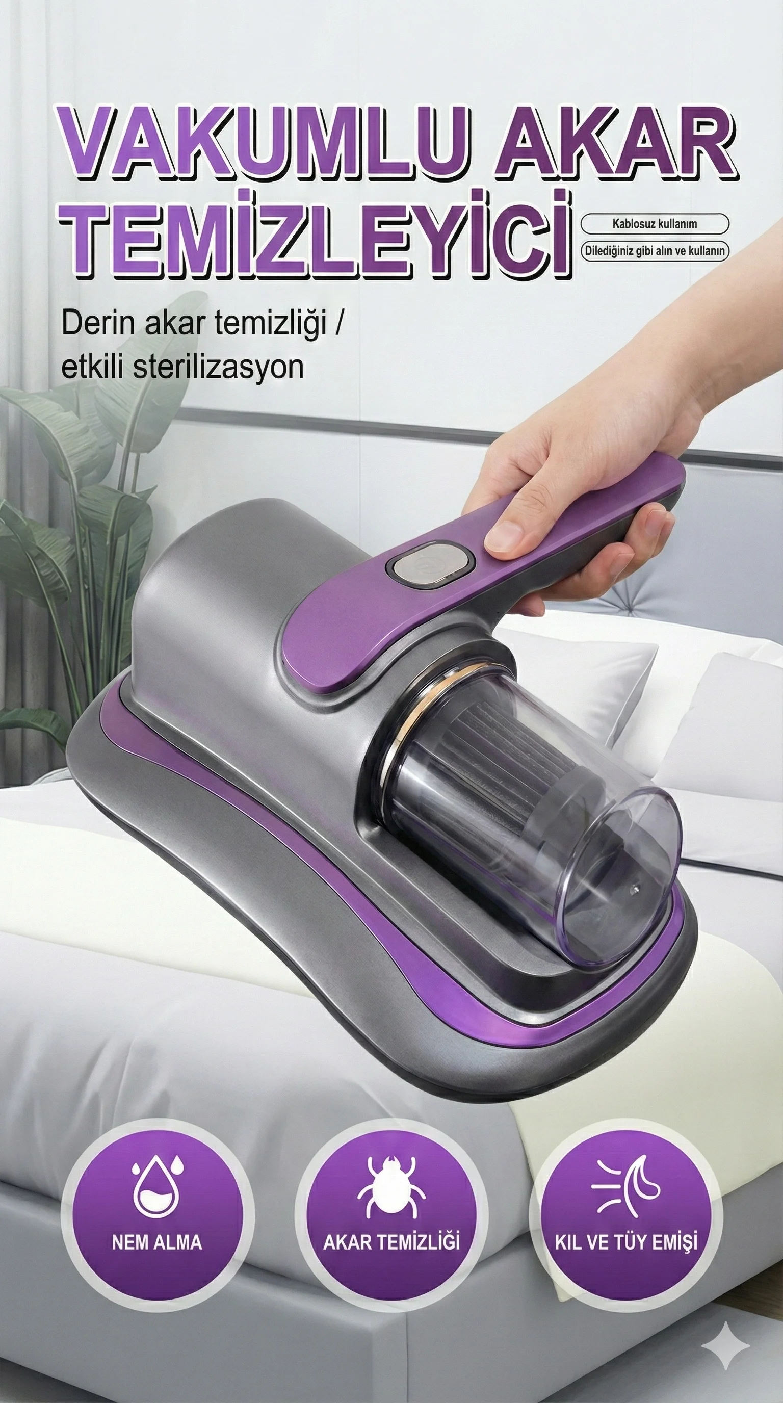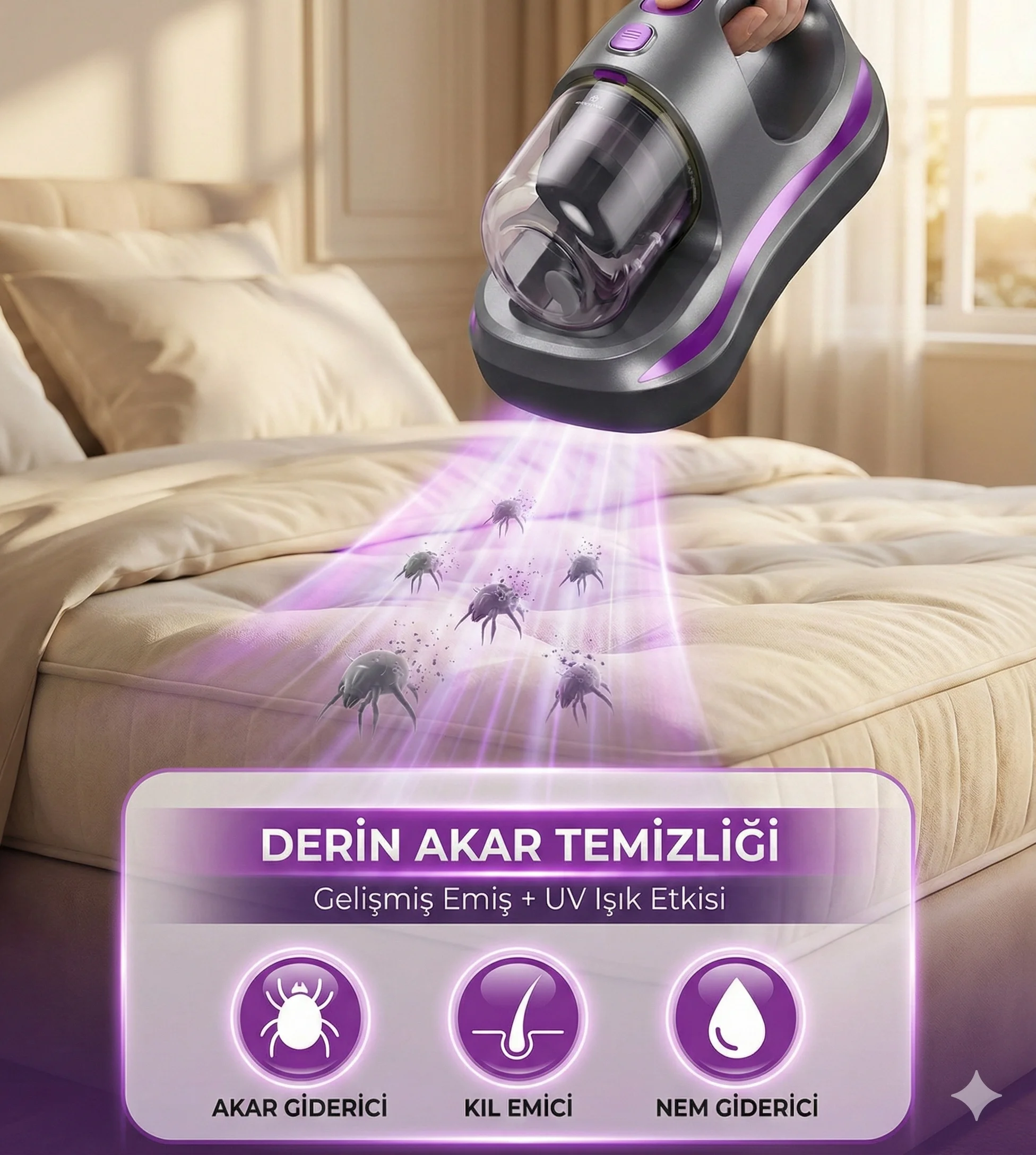 Yatak temizliği için özel olarak tasarlanmış bu gelişmiş temizlik cihazı, UV ışık teknolojisi sayesinde bakterileri, böcekleri ve akarları %99,9 oranında etkili bir şekilde uzaklaştırır. Güçlü motoru sayesinde yatağın derinliklerine kadar inerek tüm kir ve tozları içine çeker, yataklarınızı tertemiz yapar. Farklı kullanım alanlarına uygun olarak tasarlanmıştır; peluş oyuncaklar, kanepeler ve hatta giysilerde de kullanılabilir. Cihazın ince filtreleme sistemi, büyük toz parçalarını bile etkili bir şekilde hapseder. Ergonomik tasarımı ve kompakt boyutları sayesinde kullanımı son derece kolaydır.