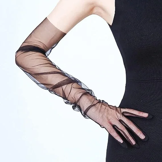 Uzun Boy Likralı Siyah Renk Yetişkin Mega Tül Eldiven