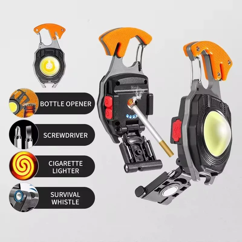 • Çok işlevli: Bu alüminyum alaşımlı anahtarlık el feneri, aydınlatma, şişe açacağı, çakmak, kesici, güçlü manyetizma, hayatta kalma düdüğü, kalem klipsi gibi birden çok işlevi birleştirir.