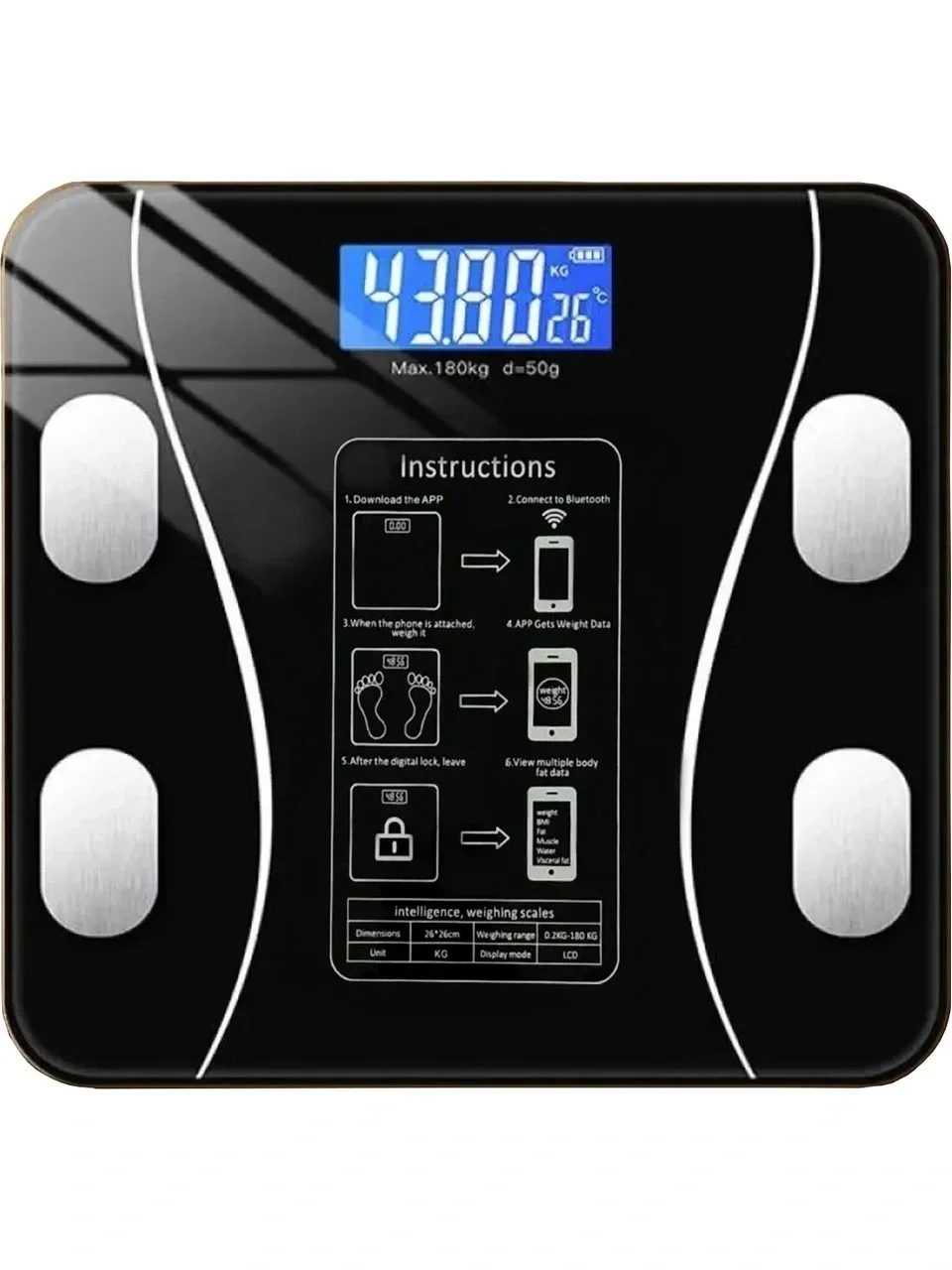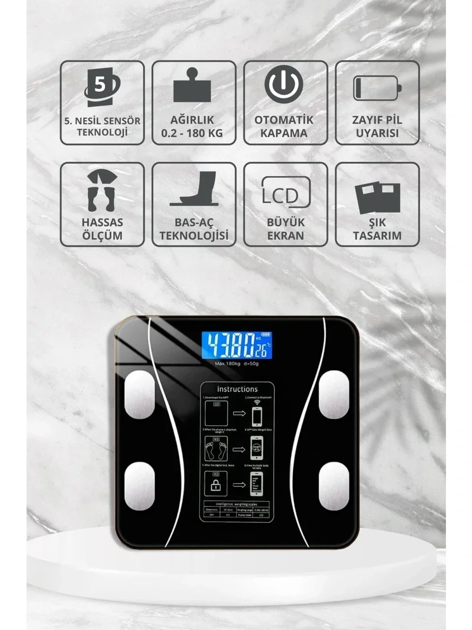 Dijital Baskül Yağ Ölçer Fonksiyonlu Akıllı Baskül Bluetooth Tartı- SiyahDijital Bluetooth Baskül - Yağ Su Kas Vücut Kitle Endeksi Kilo Ölçer Tartı Vücut Analiz Cihazı Siyah
