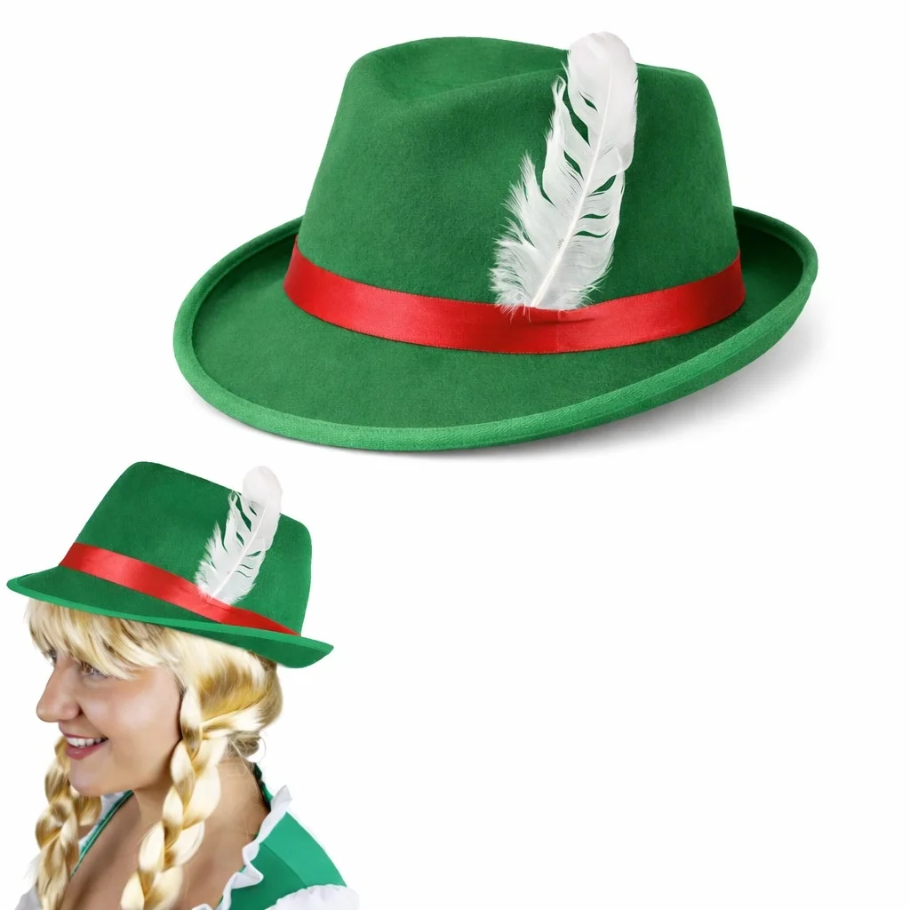 Alman Bavyera tarzından ilham alan bu yeşil tüylü şapka, eğlenceli etkinlikler ve temalı partiler için dikkat çekici bir kostüm aksesuarıdır. Üzerindeki kırmızı kurdele ve beyaz tüy detayı sayesinde klasik Alman görünümünü tamamlar.