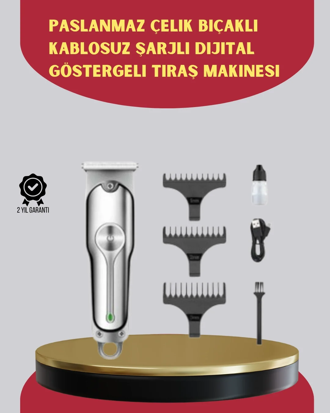 Kablosuz, Paslanmaz Çelik lı Profesyonel Saç ve Sakal Tıraş Makinesi – Sessiz, Güçlü ve Ergonomik