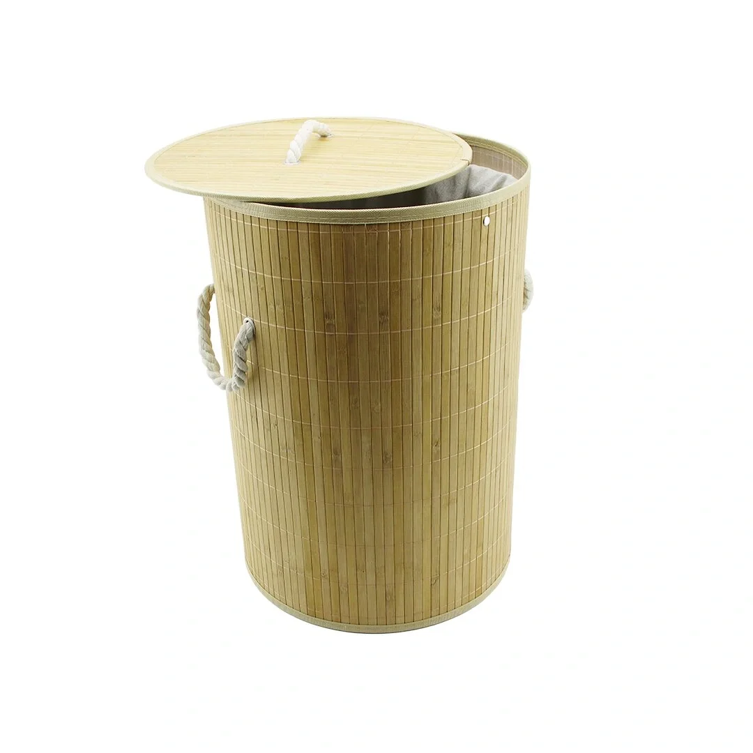 YUVARLAK BAMBU AHŞAP KİRLİ ÇAMAŞIR SEPETİ 35X60CM SEYYAR KAPAKLI İÇİ BEZLİ İP KULPLU (5047)